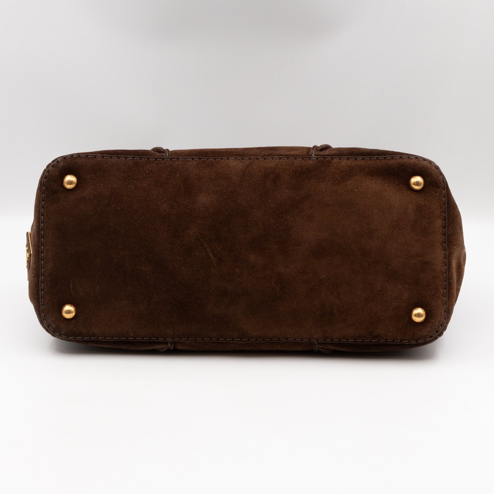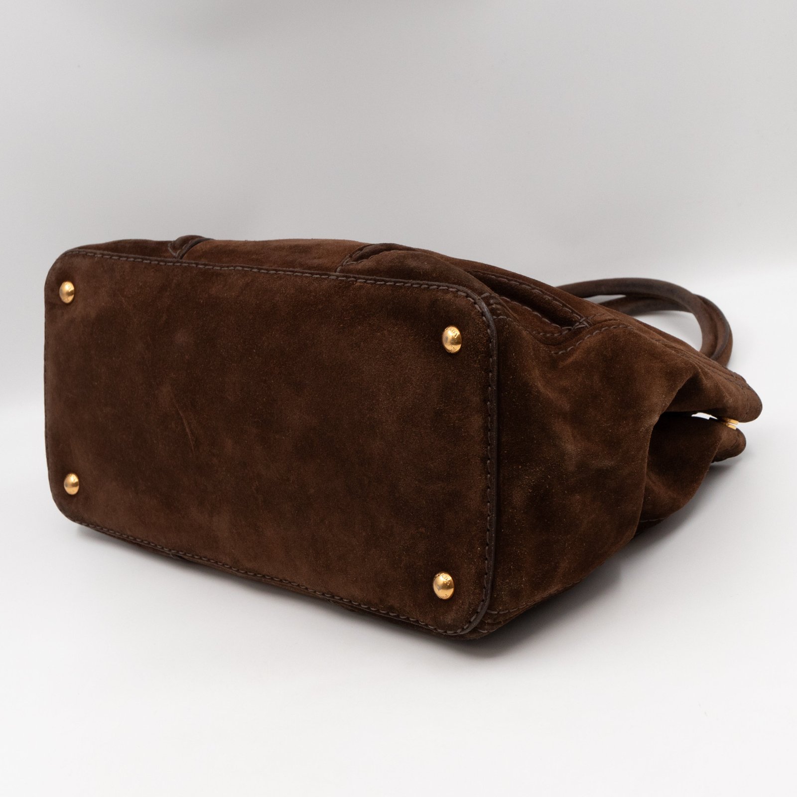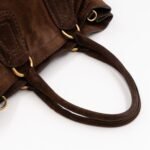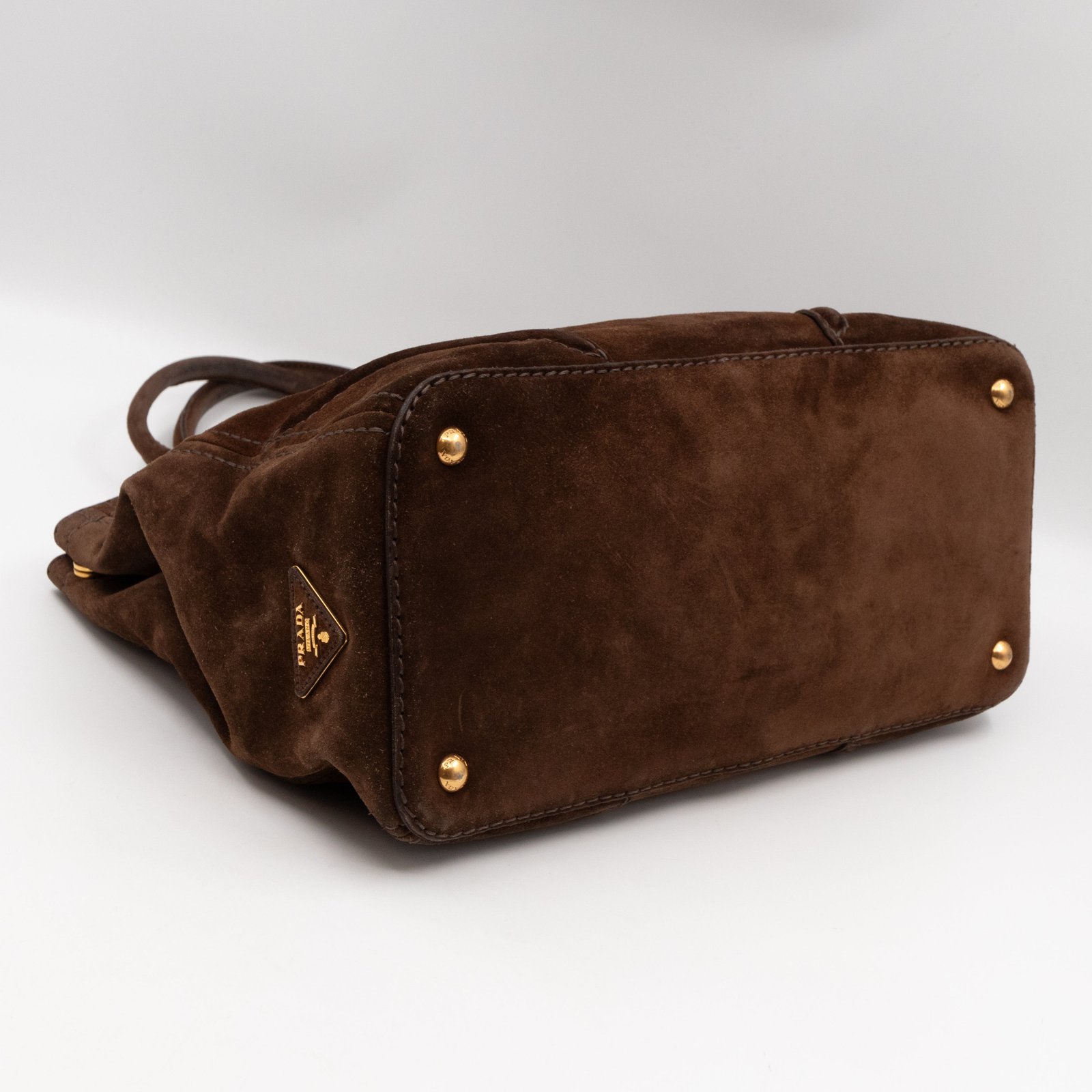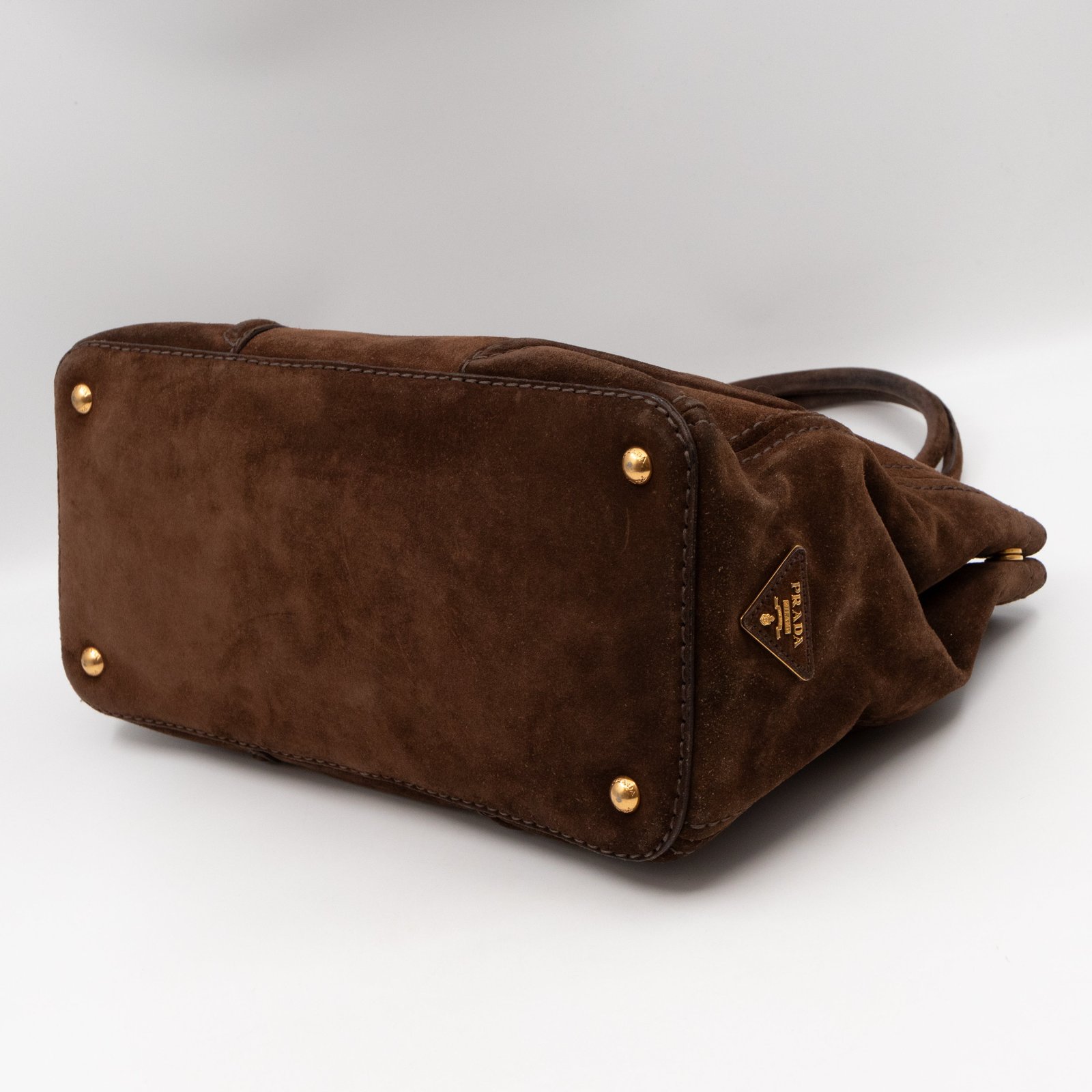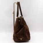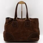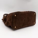 This is a Prada Bowling hand bag. This soft hand bag is made with brown suede leather and gold-tone hardware. The bag features a side Prada triangle logo and dual rolled leather handles. This top opens with a magnet to a compartment one zipper pocket and two small slim pocket. Has a adjustable shoulder strap for easy carrying. Easy to use everyday, with documents, iPad, and all daily items.