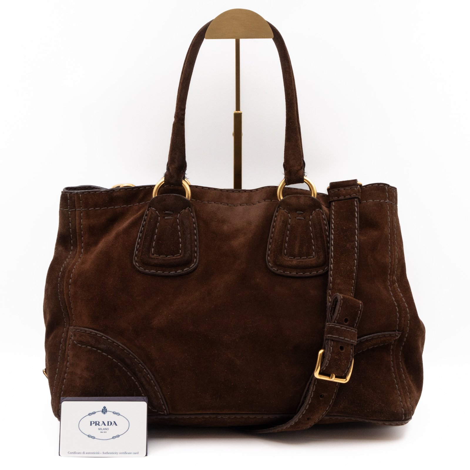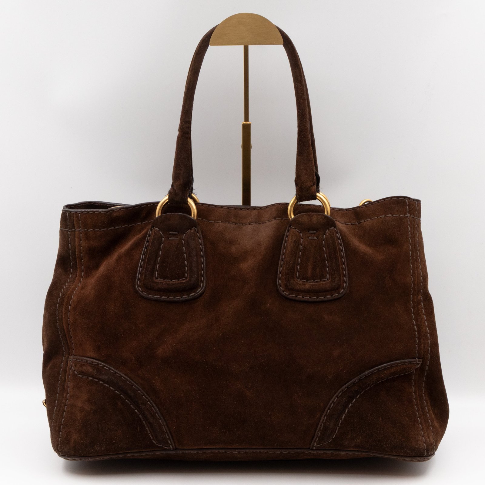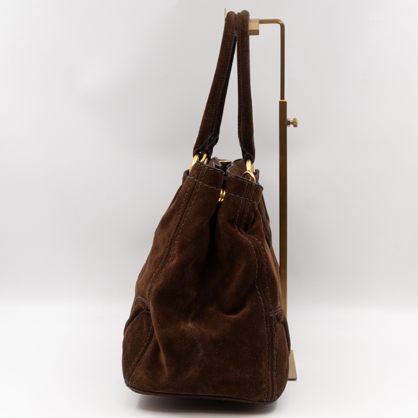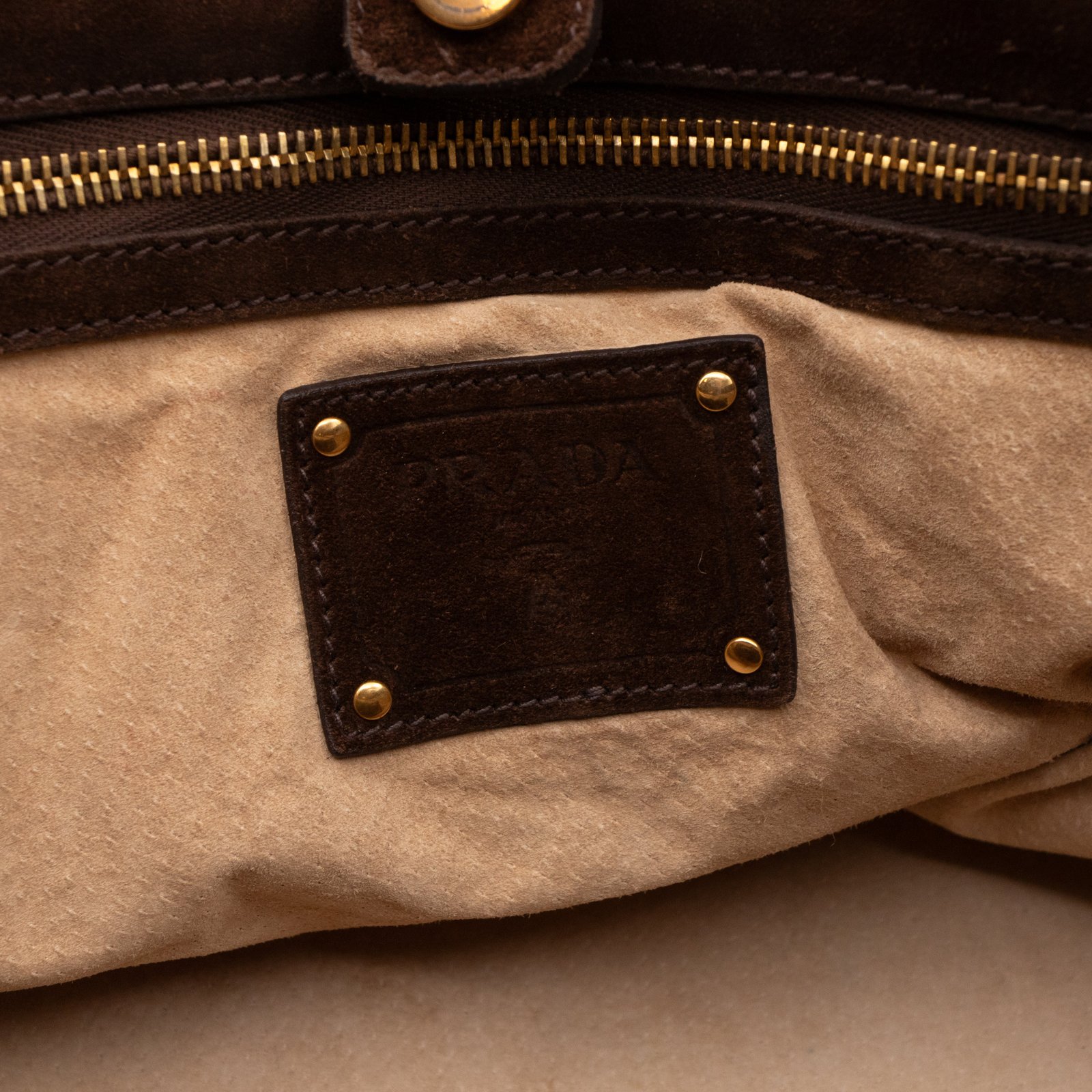 This is a Prada Bowling hand bag. This soft hand bag is made with brown suede leather and gold-tone hardware. The bag features a side Prada triangle logo and dual rolled leather handles. This top opens with a magnet to a compartment one zipper pocket and two small slim pocket. Has a adjustable shoulder strap for easy carrying. Easy to use everyday, with documents, iPad, and all daily items.