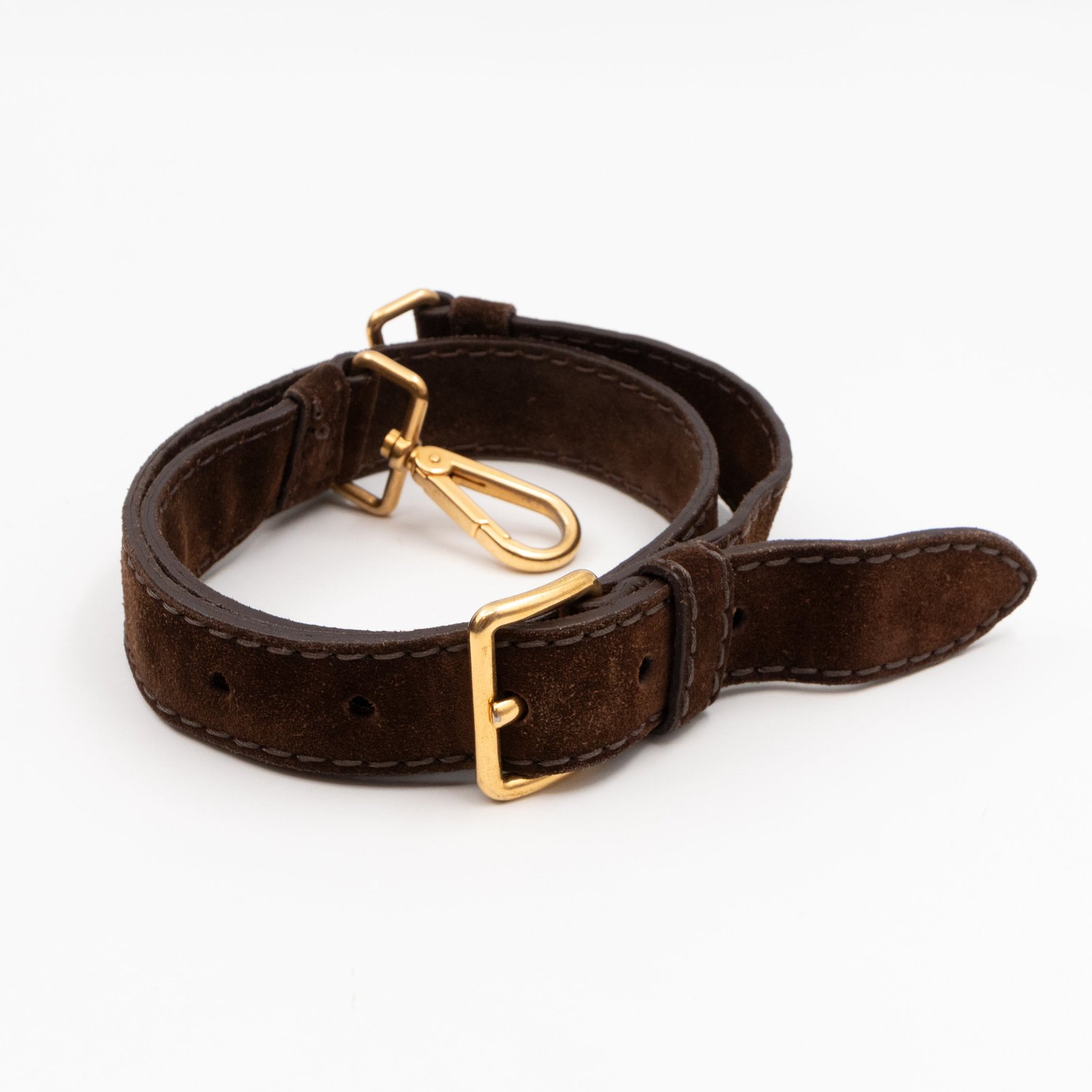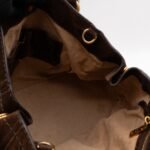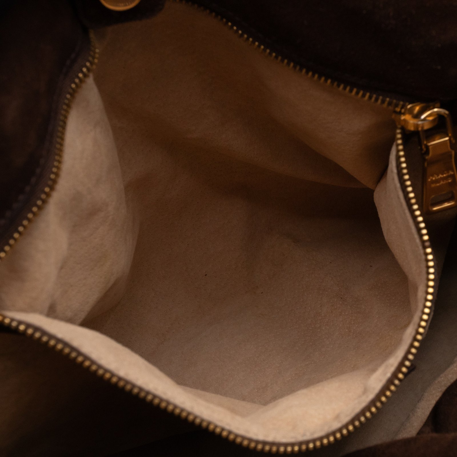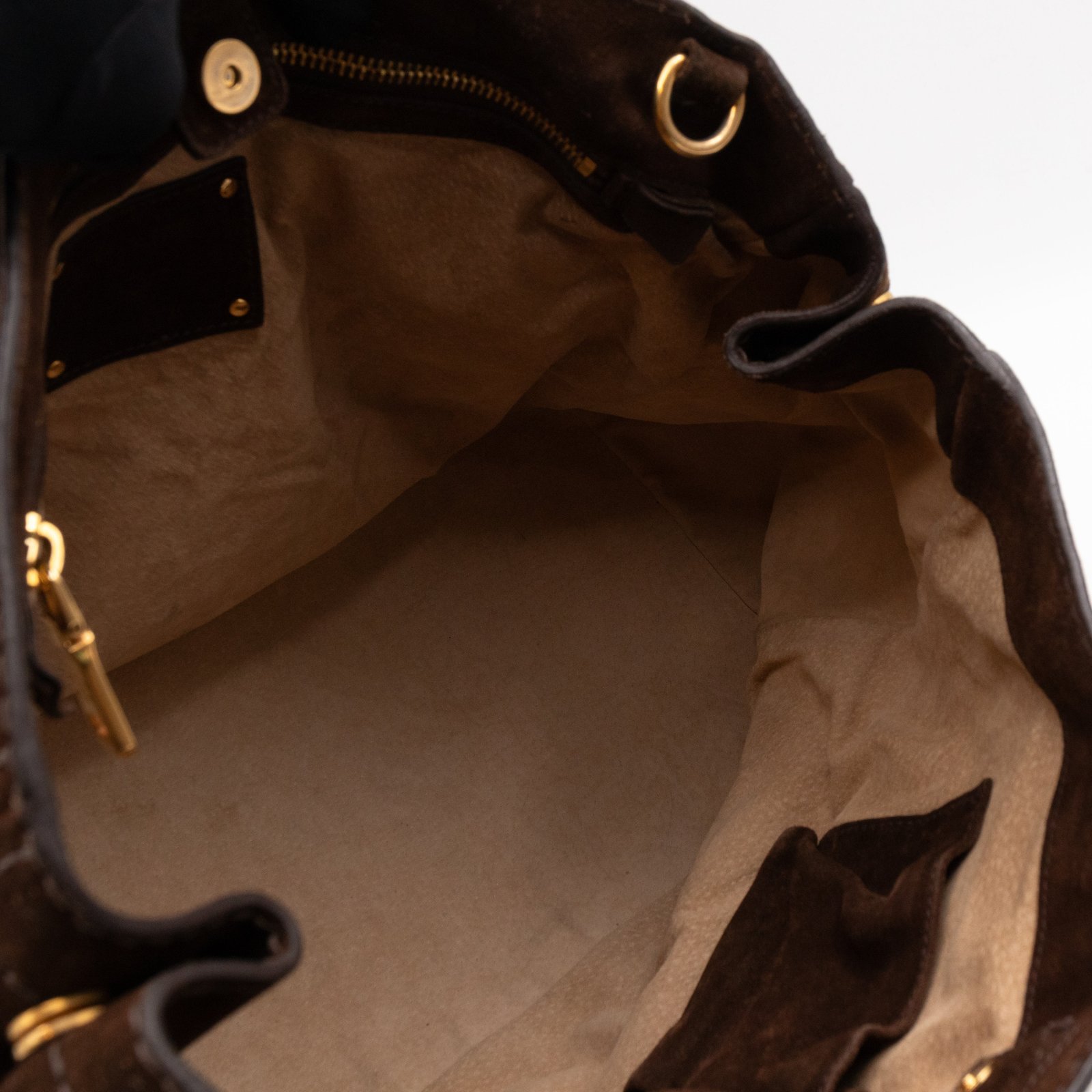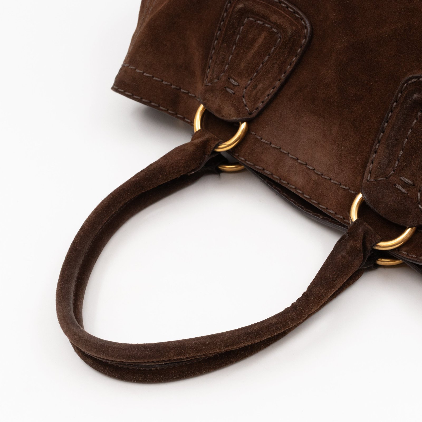 This is a Prada Bowling hand bag. This soft hand bag is made with brown suede leather and gold-tone hardware. The bag features a side Prada triangle logo and dual rolled leather handles. This top opens with a magnet to a compartment one zipper pocket and two small slim pocket. Has a adjustable shoulder strap for easy carrying. Easy to use everyday, with documents, iPad, and all daily items.