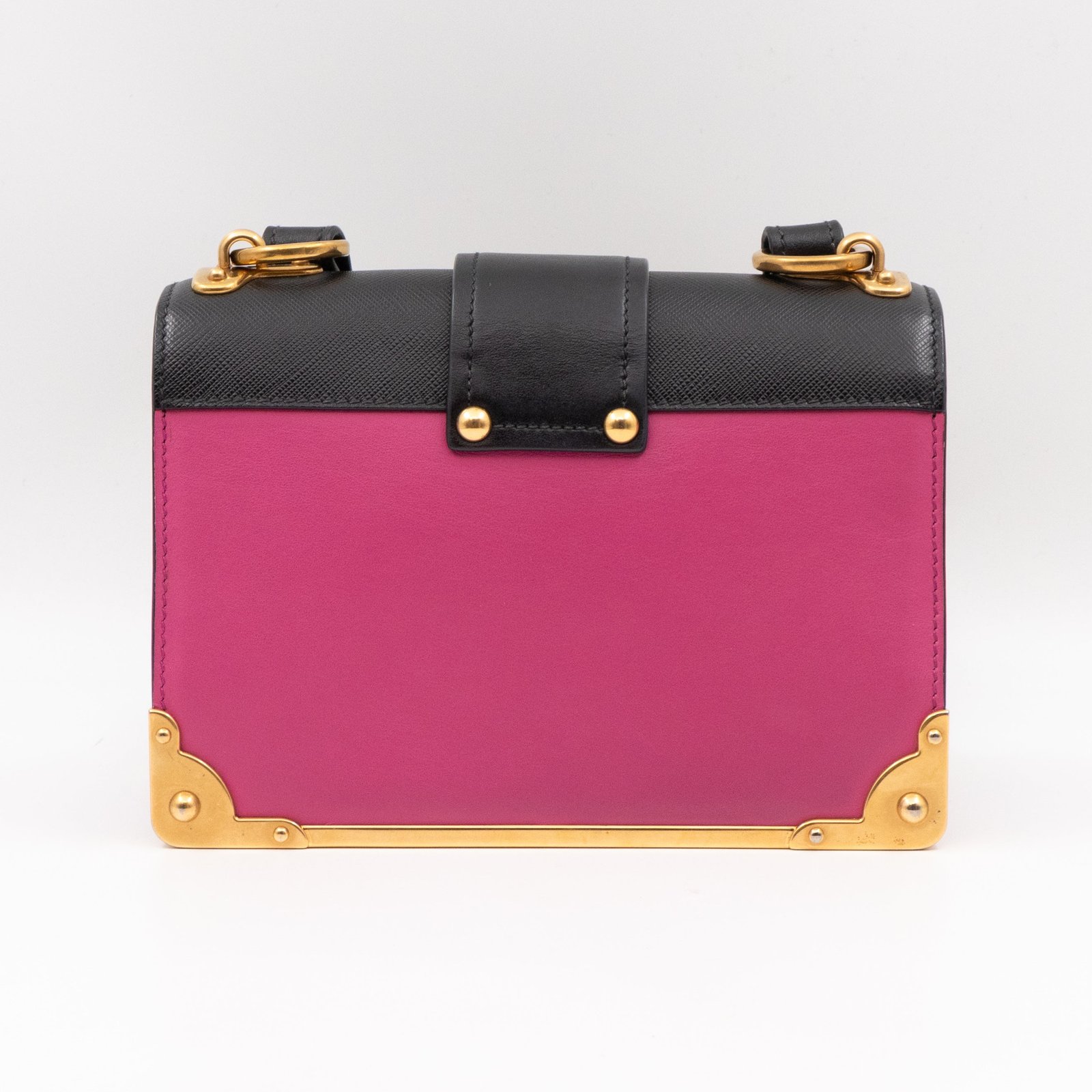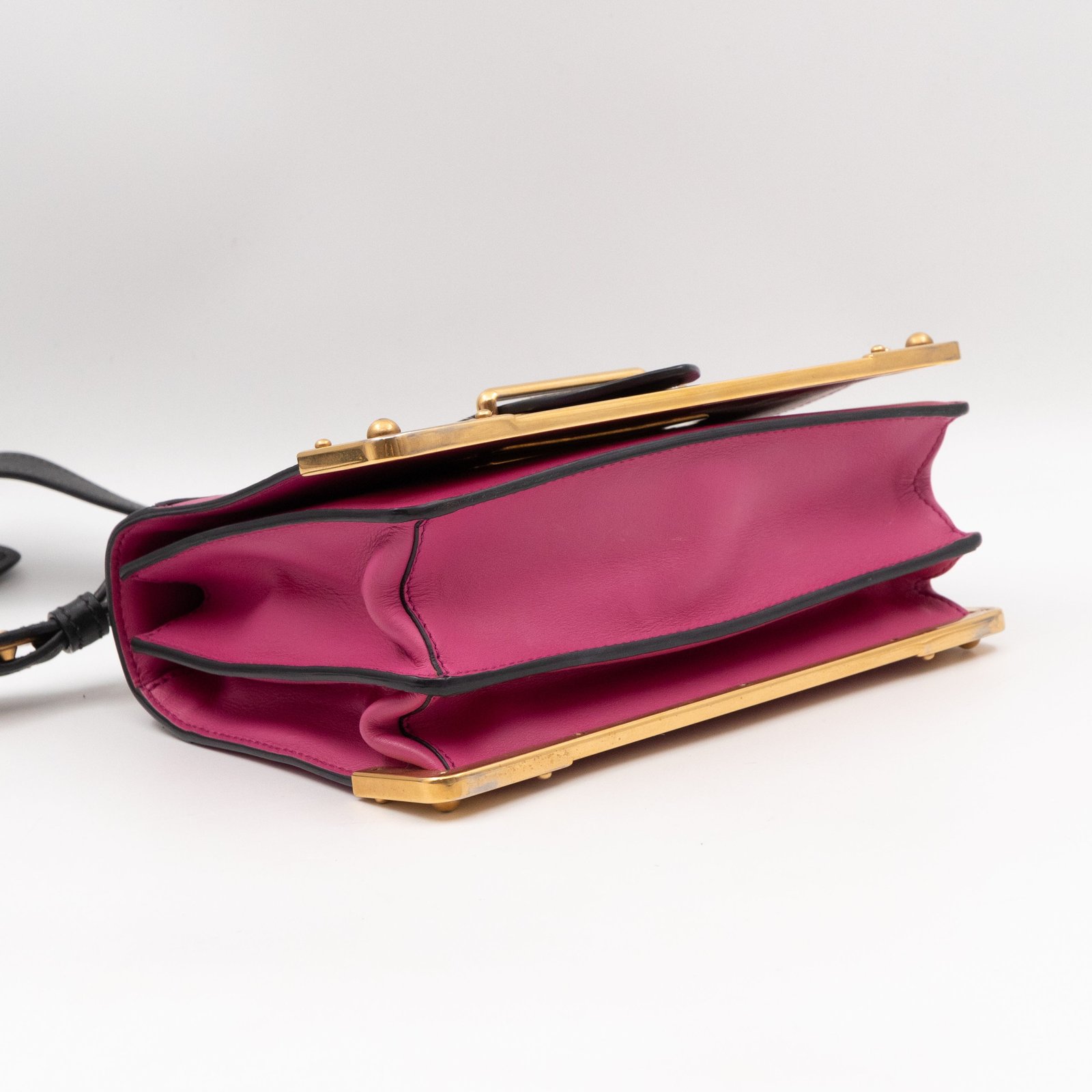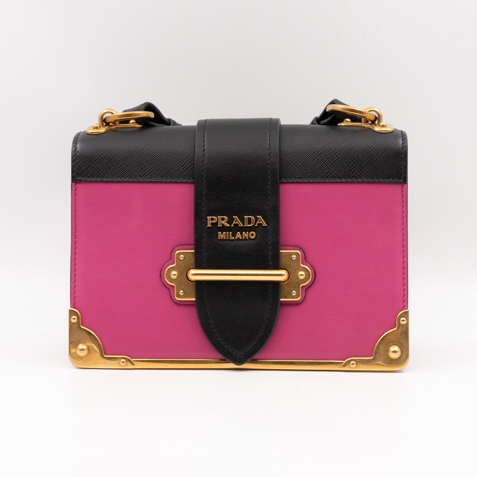 This elegant Cahier bag from Prada is a classic beauty. Made with pink leather featuring the Cahier style metal corners and details in aged gold-tone metal. On the front a large black leather flap which opens to an interior with a pocket. Features a wide adjustable leather strap for easy and stylish crossbody carrying. Retail price is €3200.