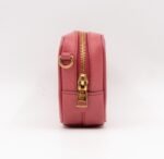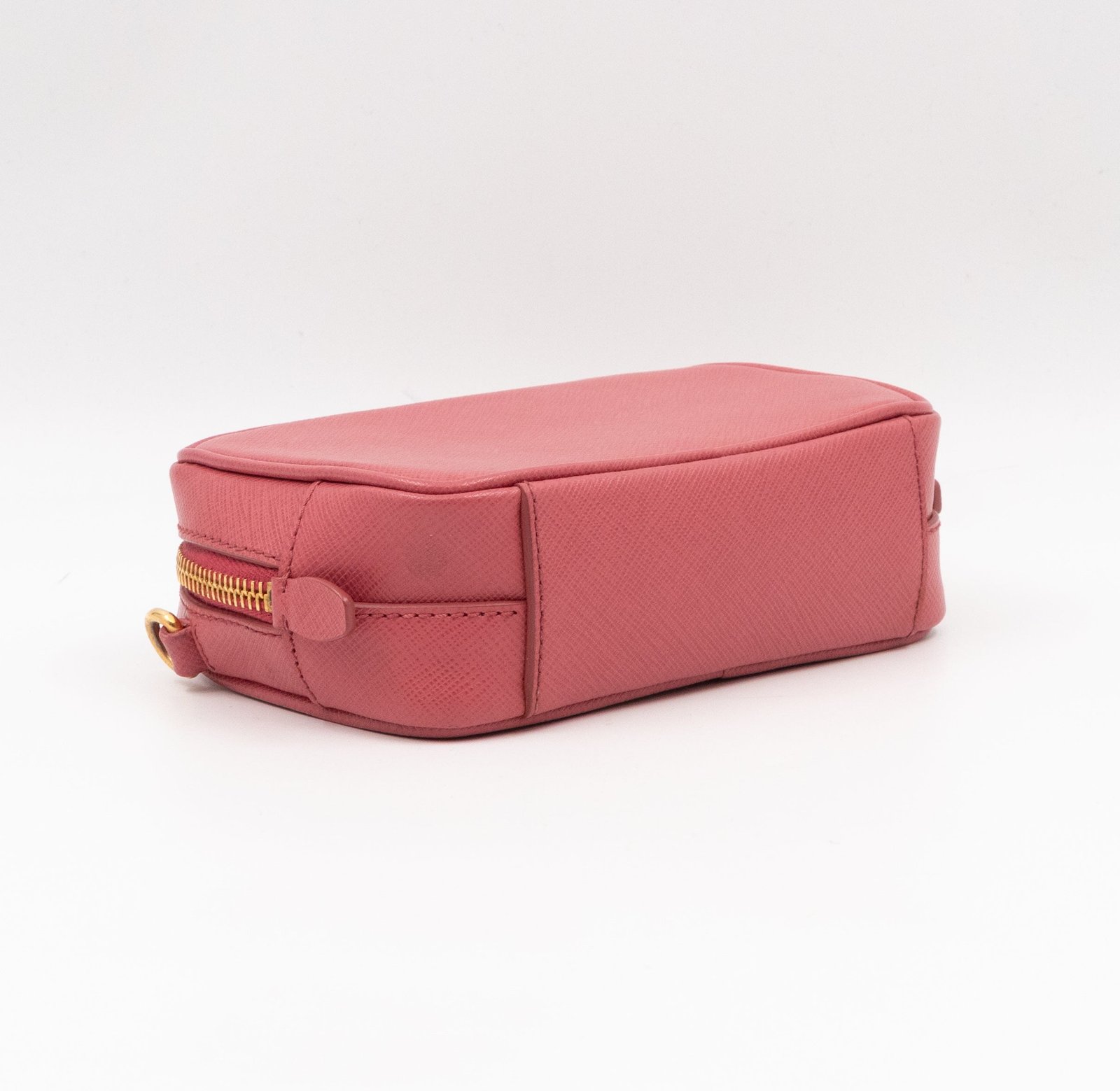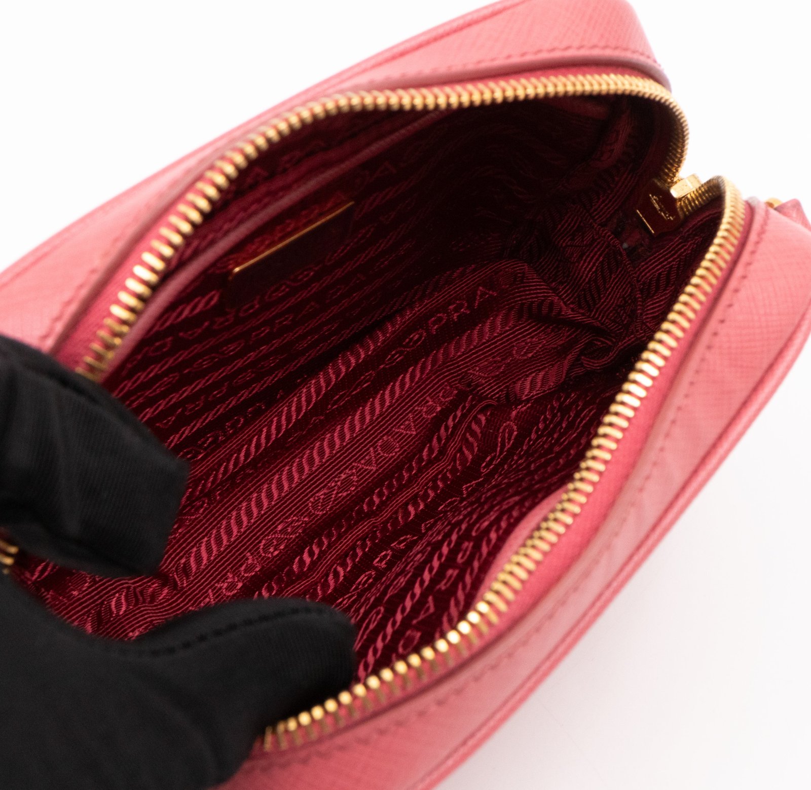A Prada crossbody camera bag in classic pink saffiano leather. This small sized bag has a removable shoulder strap for comfortable crossbody use. Great for daily use for your phone, cards, and keys. Inside has two slim pockets. On front a Prada logo in gold color. Inside fits a phone with max length is 14 cm.