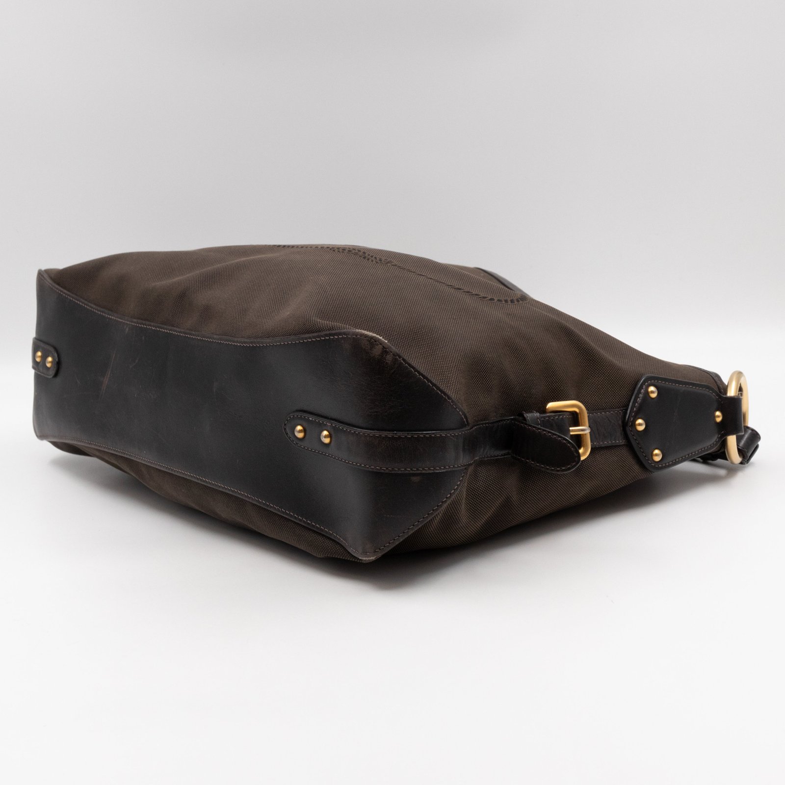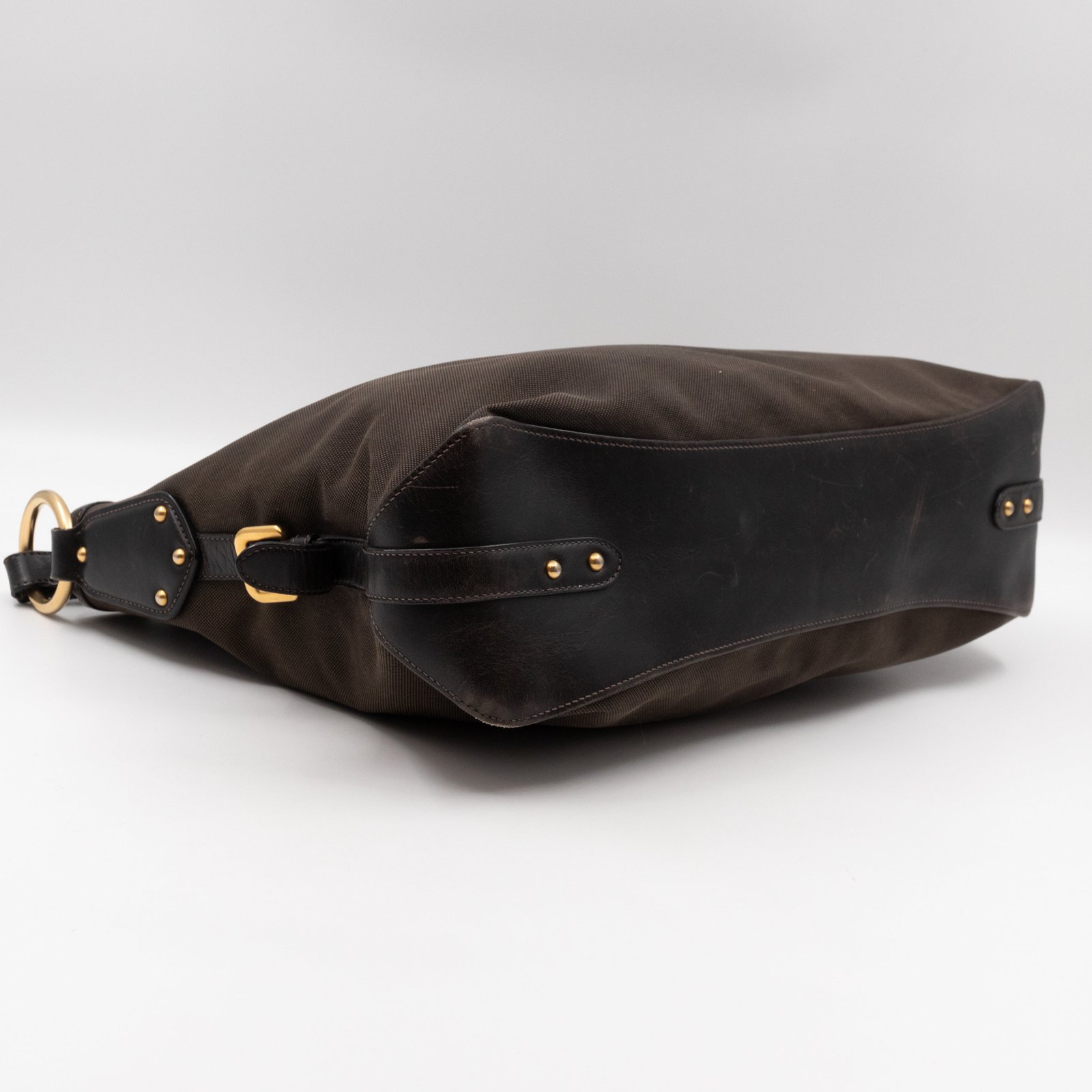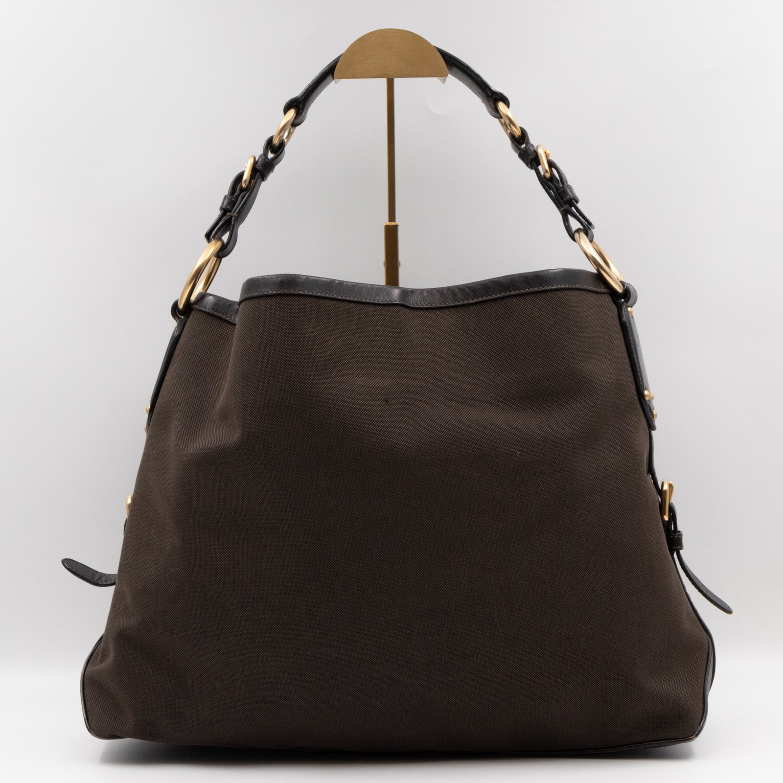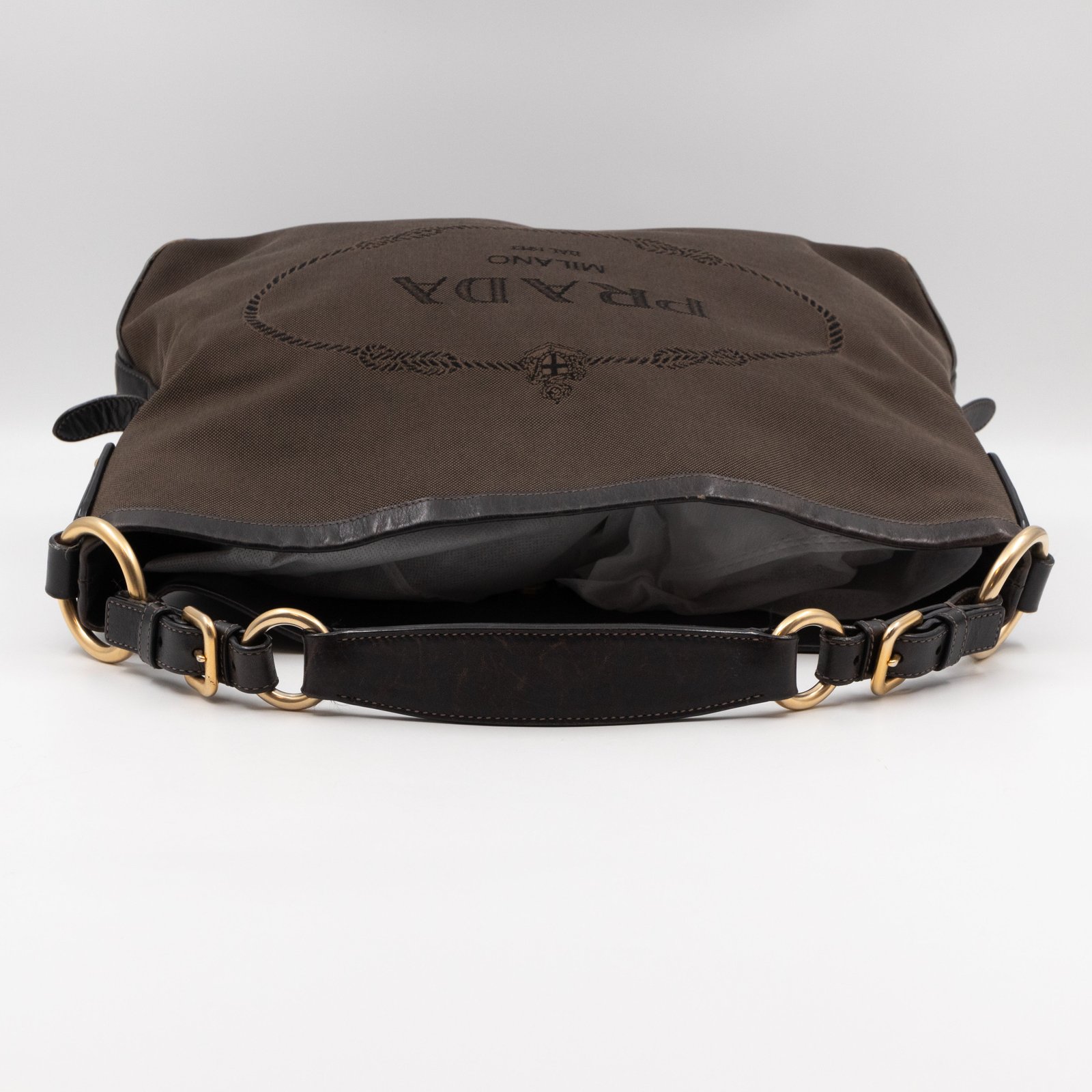 A Prada Canapa Hobo bag in brown canvas. Made in brown canvas and leather with gold-tone hardware. Convenient every day bag, nice size to carry your daily items. Single handle on large rings for comfortable shoulder carrying. Inside is a zipper pocket, the middle has a button closure.