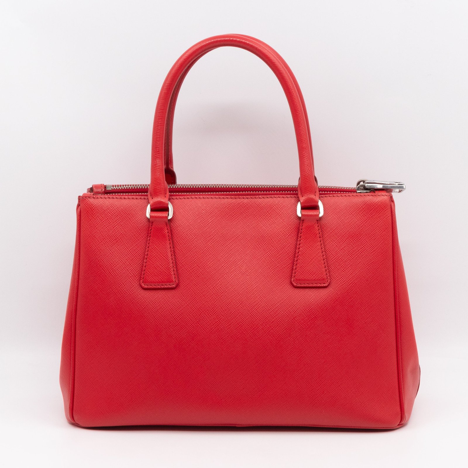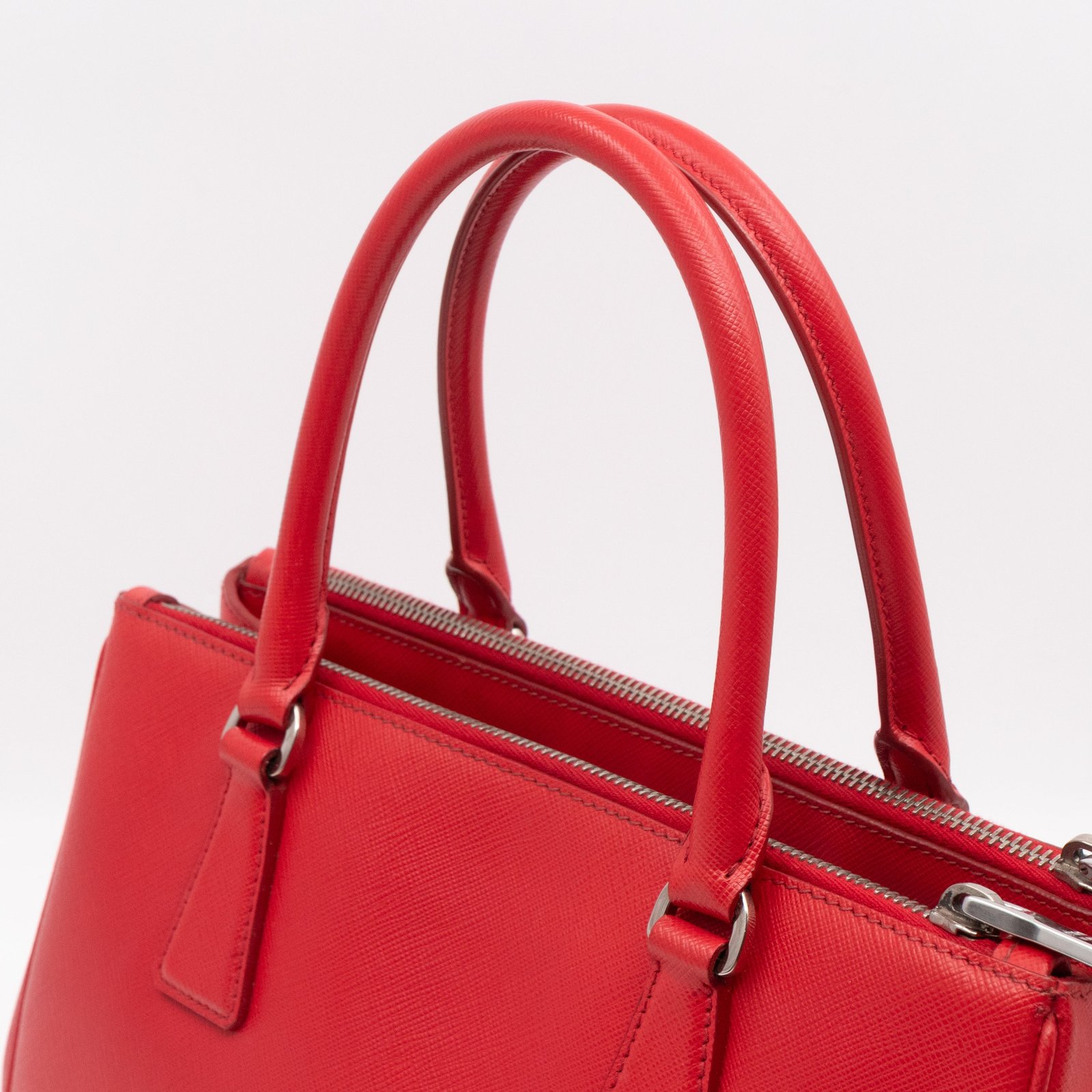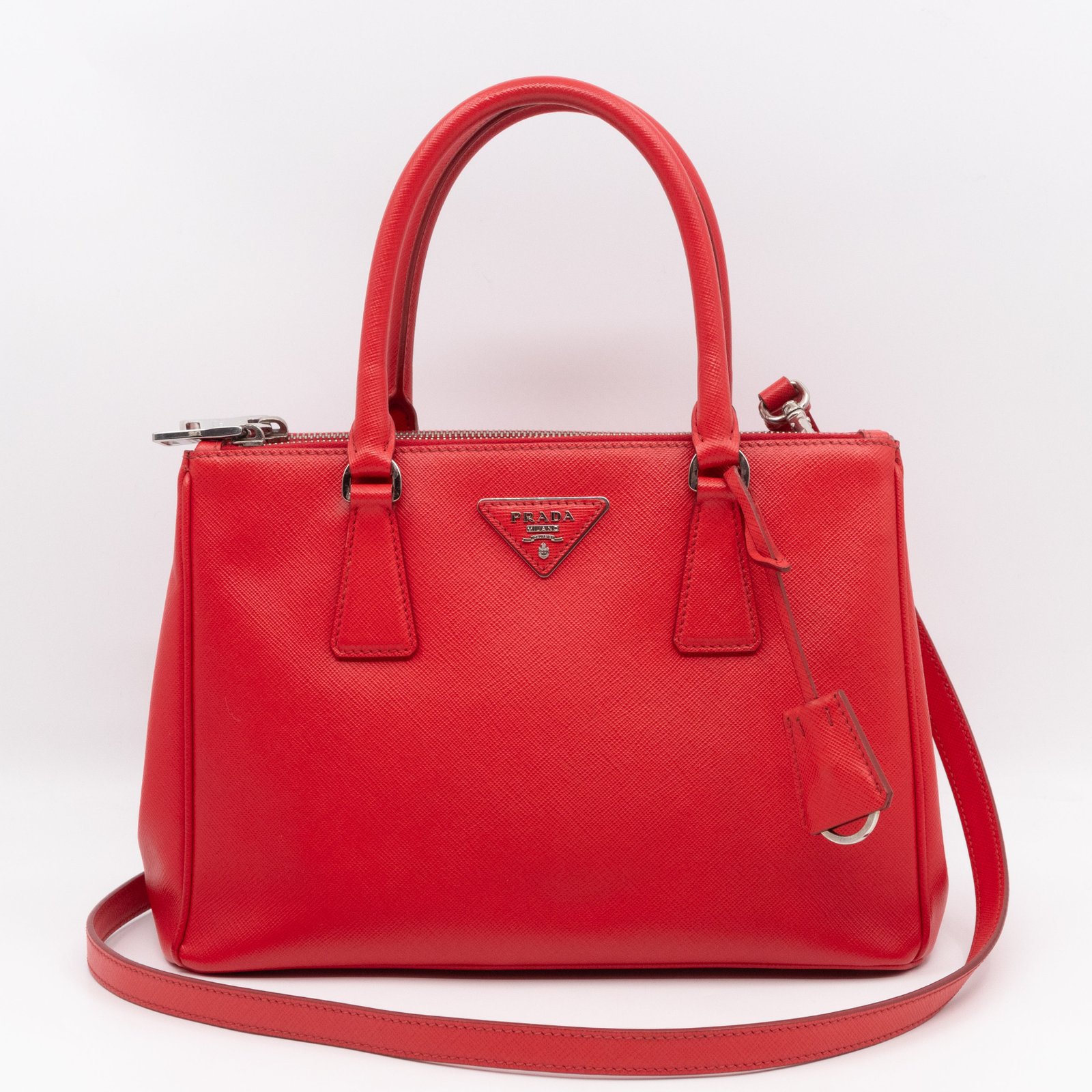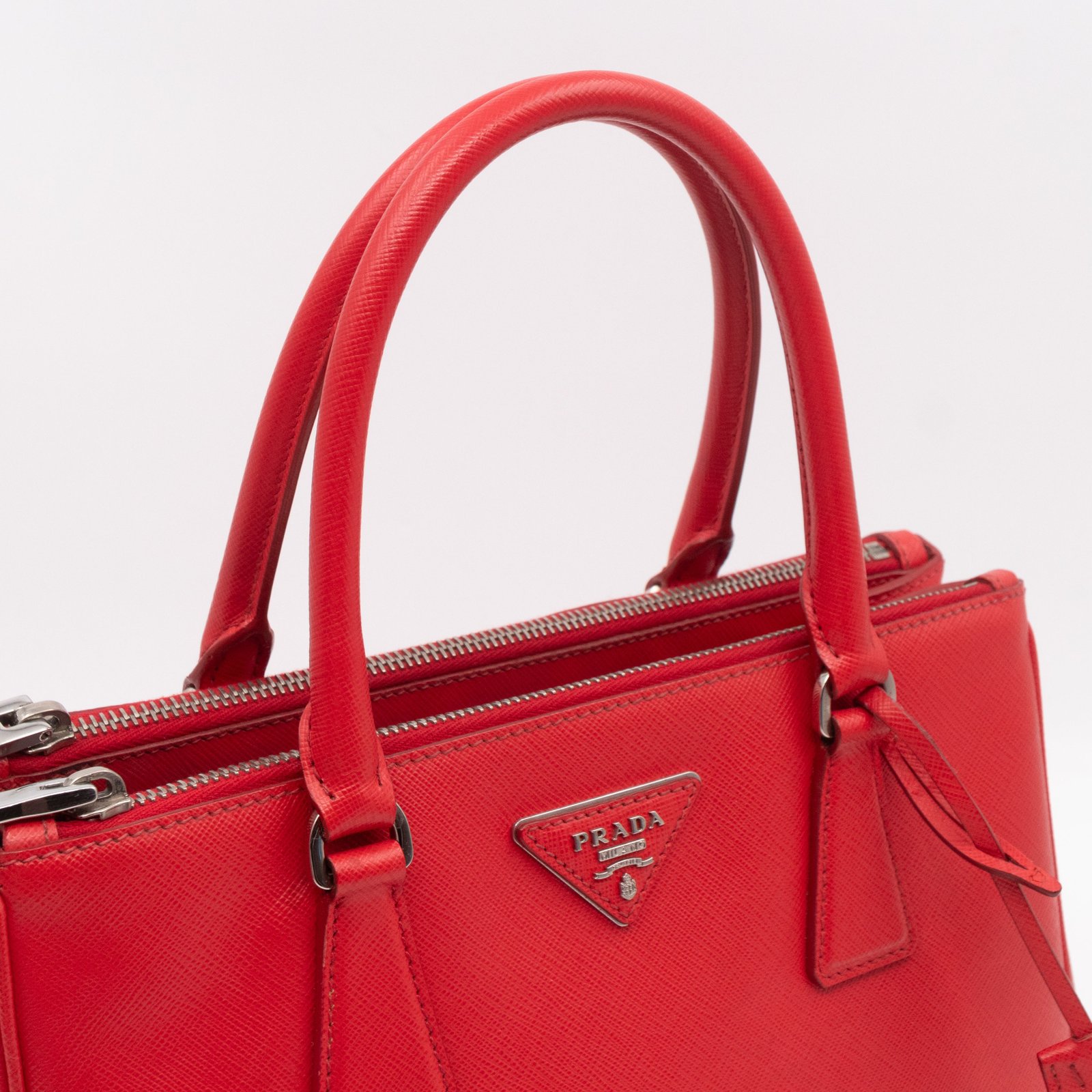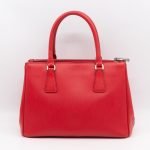 A Prada Galleria Medium Double Zip bag in durable Saffiano leather. Very convenient double zipper bag in nice red color, combined with silver-tone hardware. This medium edition size fits your phone, wallet, documents and so on, even a smaller laptop or iPad fits nicely. Great choice for daily use. Each side has zipper pockets, the middle compartment expands to a spacious size. Current retail price €3700.