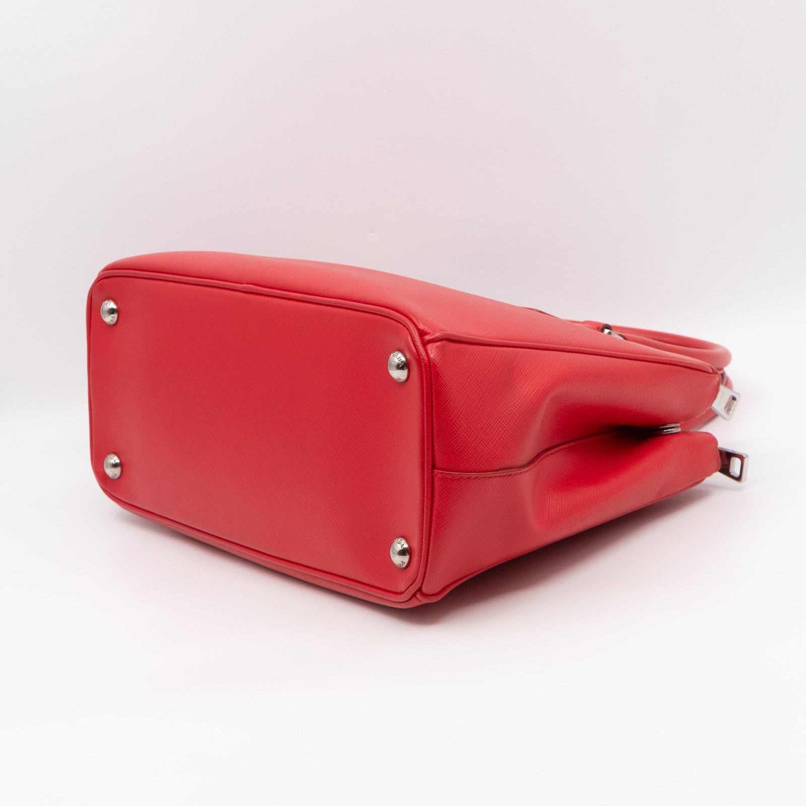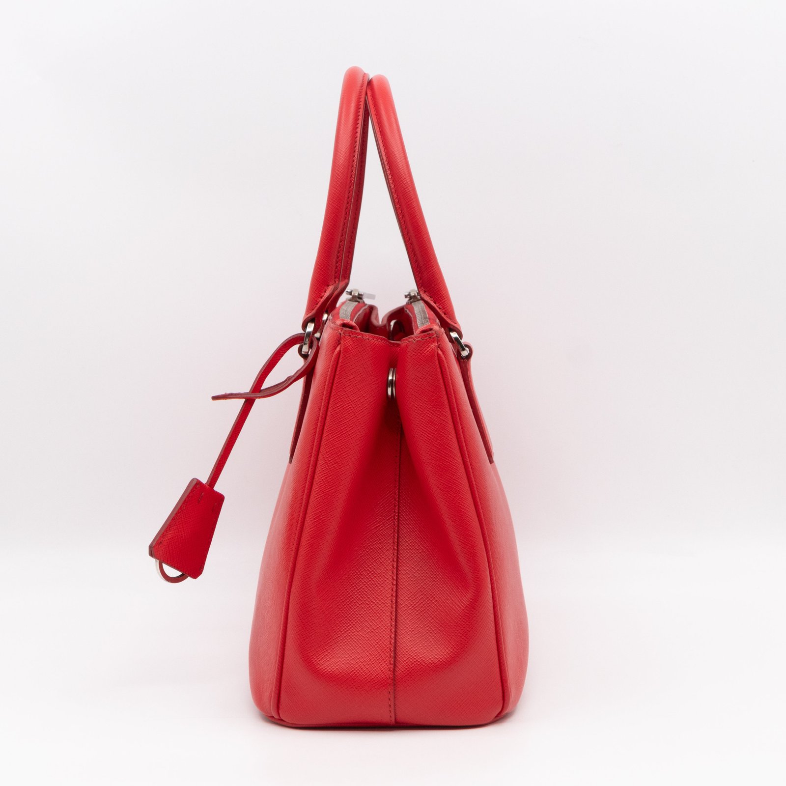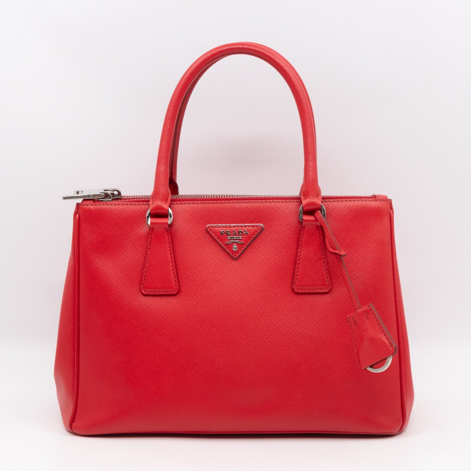 A Prada Galleria Medium Double Zip bag in durable Saffiano leather. Very convenient double zipper bag in nice red color, combined with silver-tone hardware. This medium edition size fits your phone, wallet, documents and so on, even a smaller laptop or iPad fits nicely. Great choice for daily use. Each side has zipper pockets, the middle compartment expands to a spacious size. Current retail price €3700.