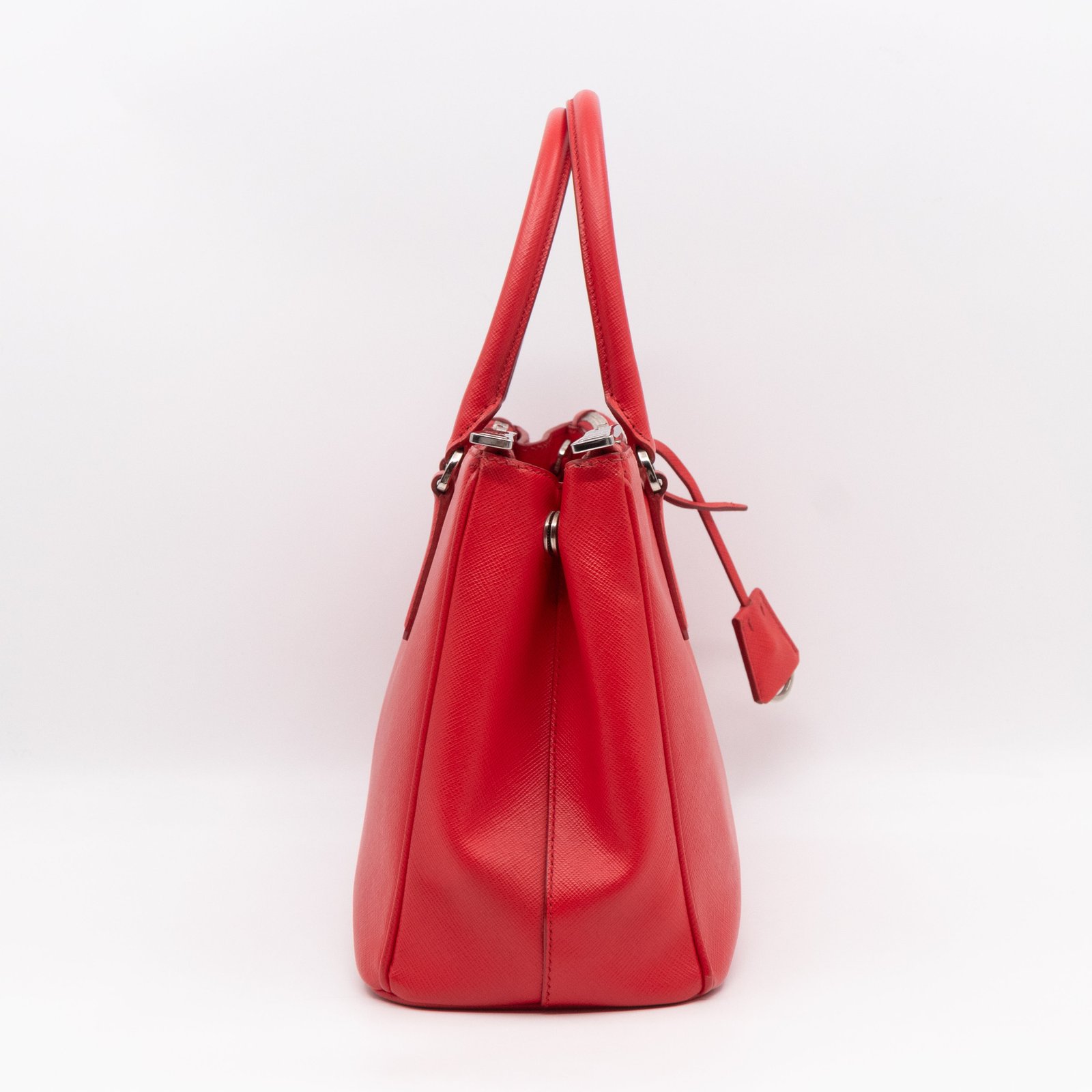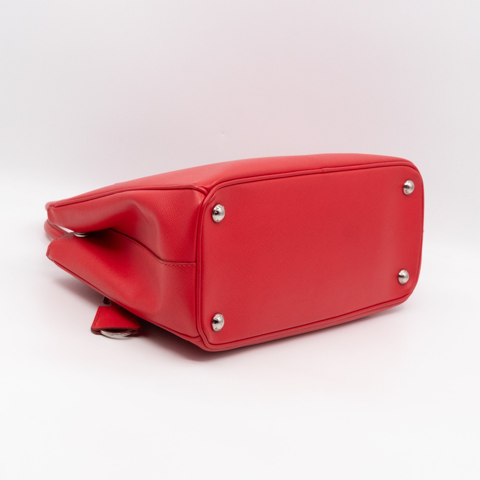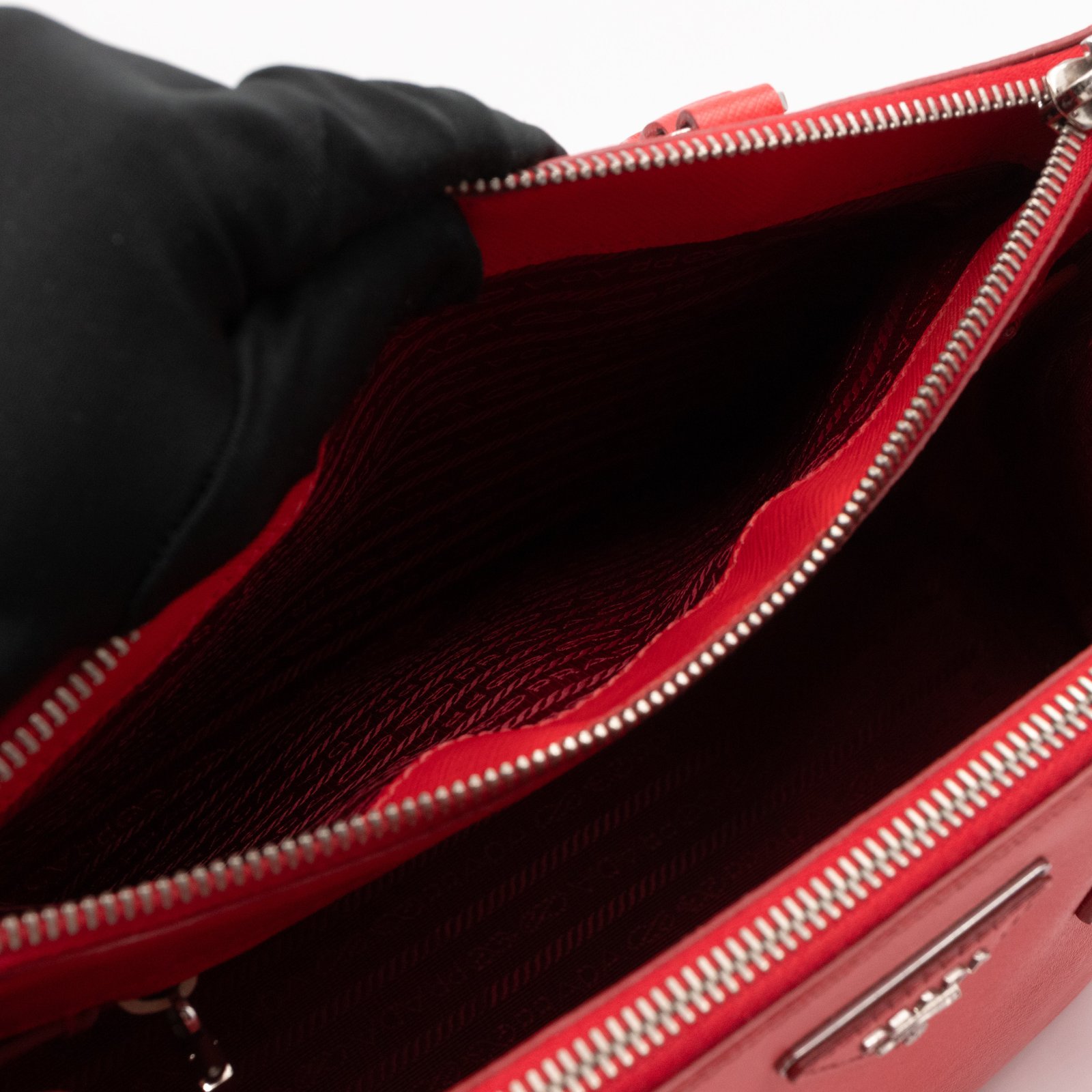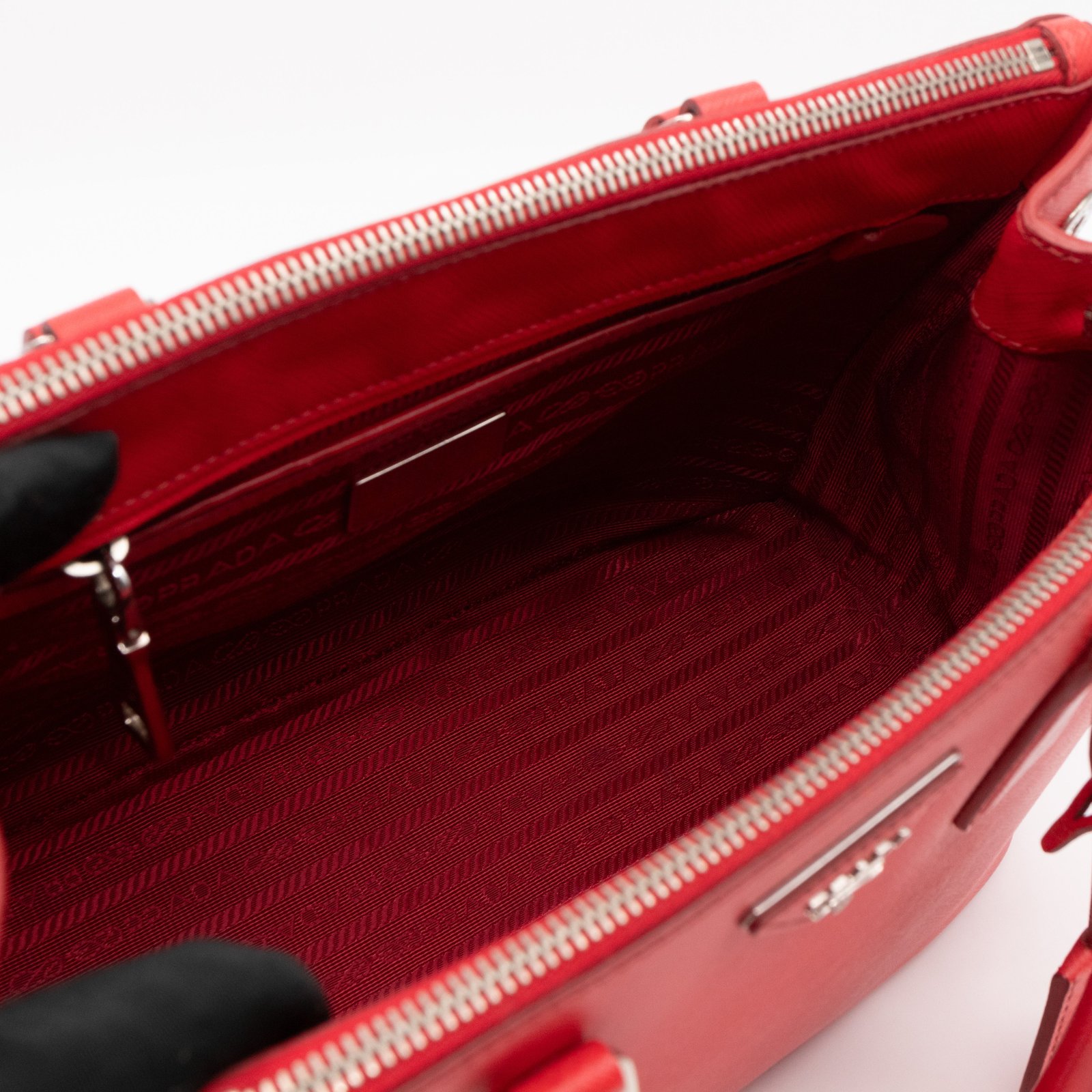 A Prada Galleria Medium Double Zip bag in durable Saffiano leather. Very convenient double zipper bag in nice red color, combined with silver-tone hardware. This medium edition size fits your phone, wallet, documents and so on, even a smaller laptop or iPad fits nicely. Great choice for daily use. Each side has zipper pockets, the middle compartment expands to a spacious size. Current retail price €3700.