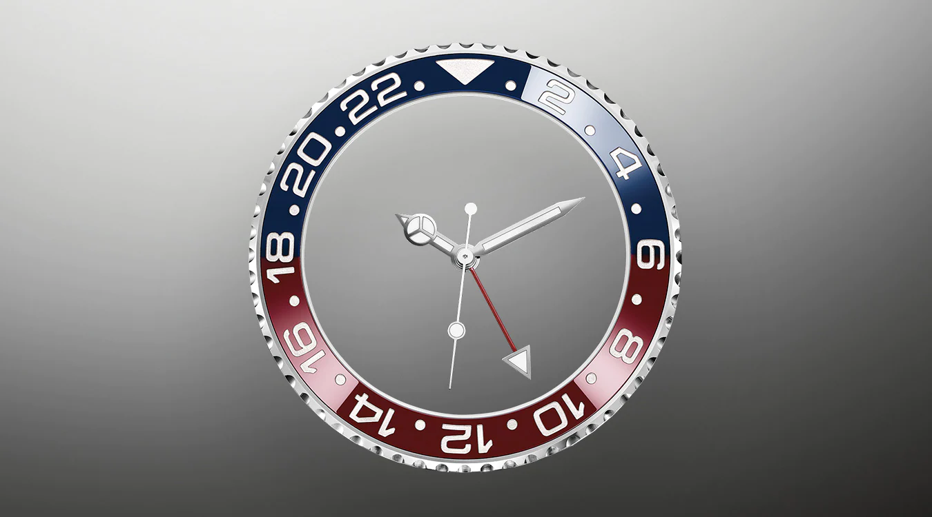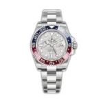 This model features a meteorite dial and a two-colour Cerachrom bezel insert in red and blue ceramic. Designed to show the time in two different time zones simultaneously during intercontinental flights, the GMT-Master II has come to be recognized for its robustness and versatile appearance.