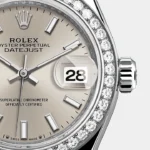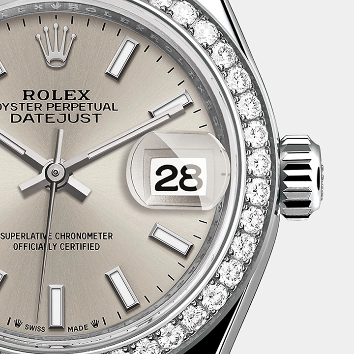 The light reflections on the case sides and lugs highlight the elegant profile of the 28 mm Oyster case, which is fitted with a diamond-set bezel. Rolex’s classic feminine watch, the Lady-Datejust is in the lineage of the Datejust, the emblematic model that has been a byword for style and accurate timekeeping.