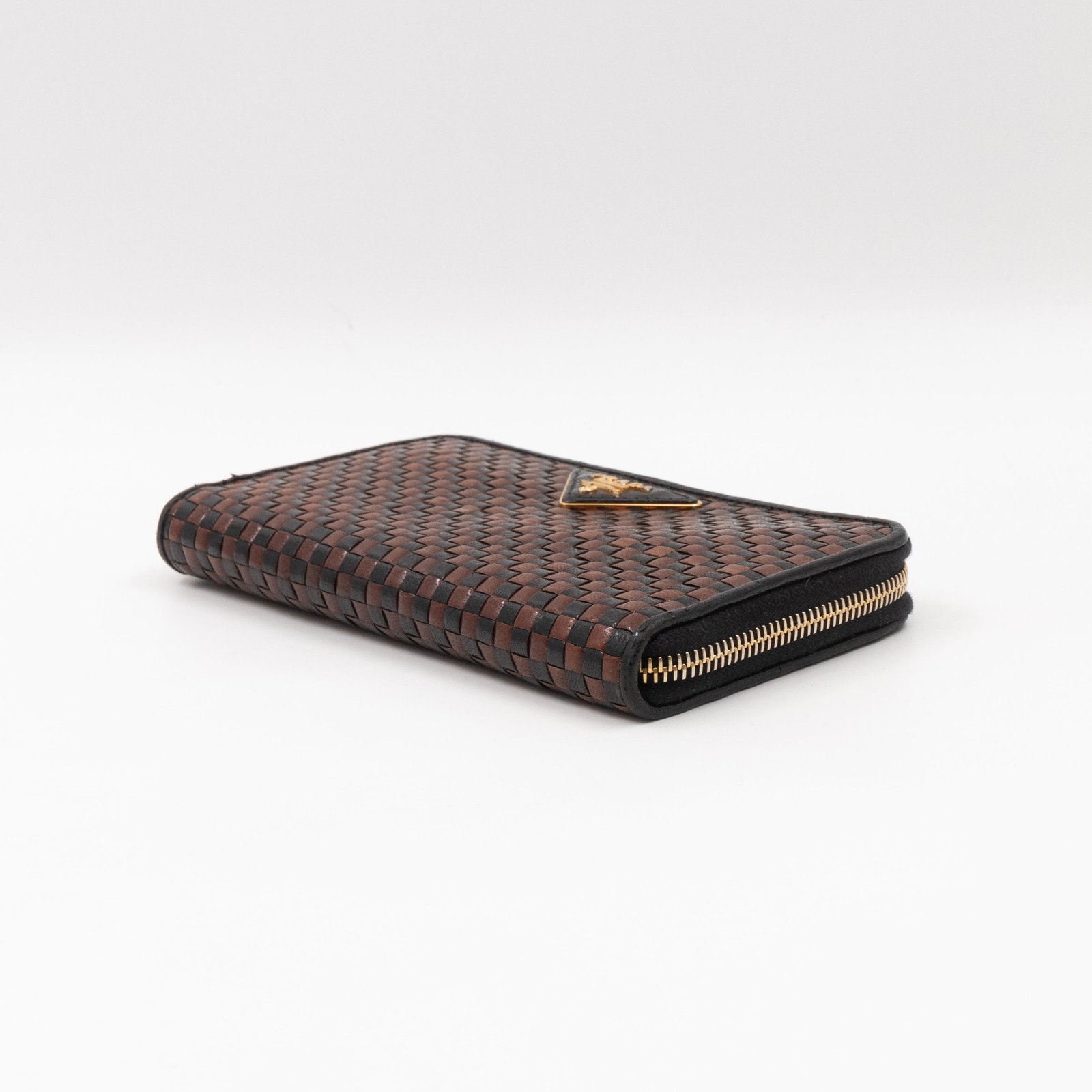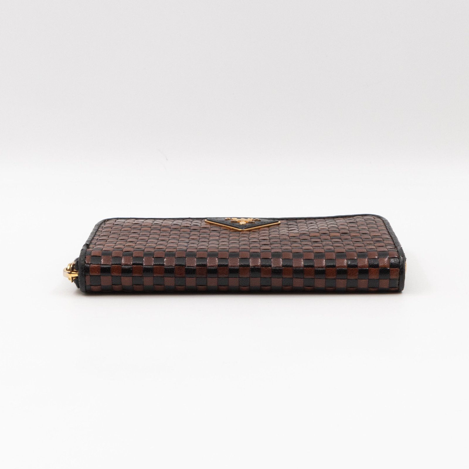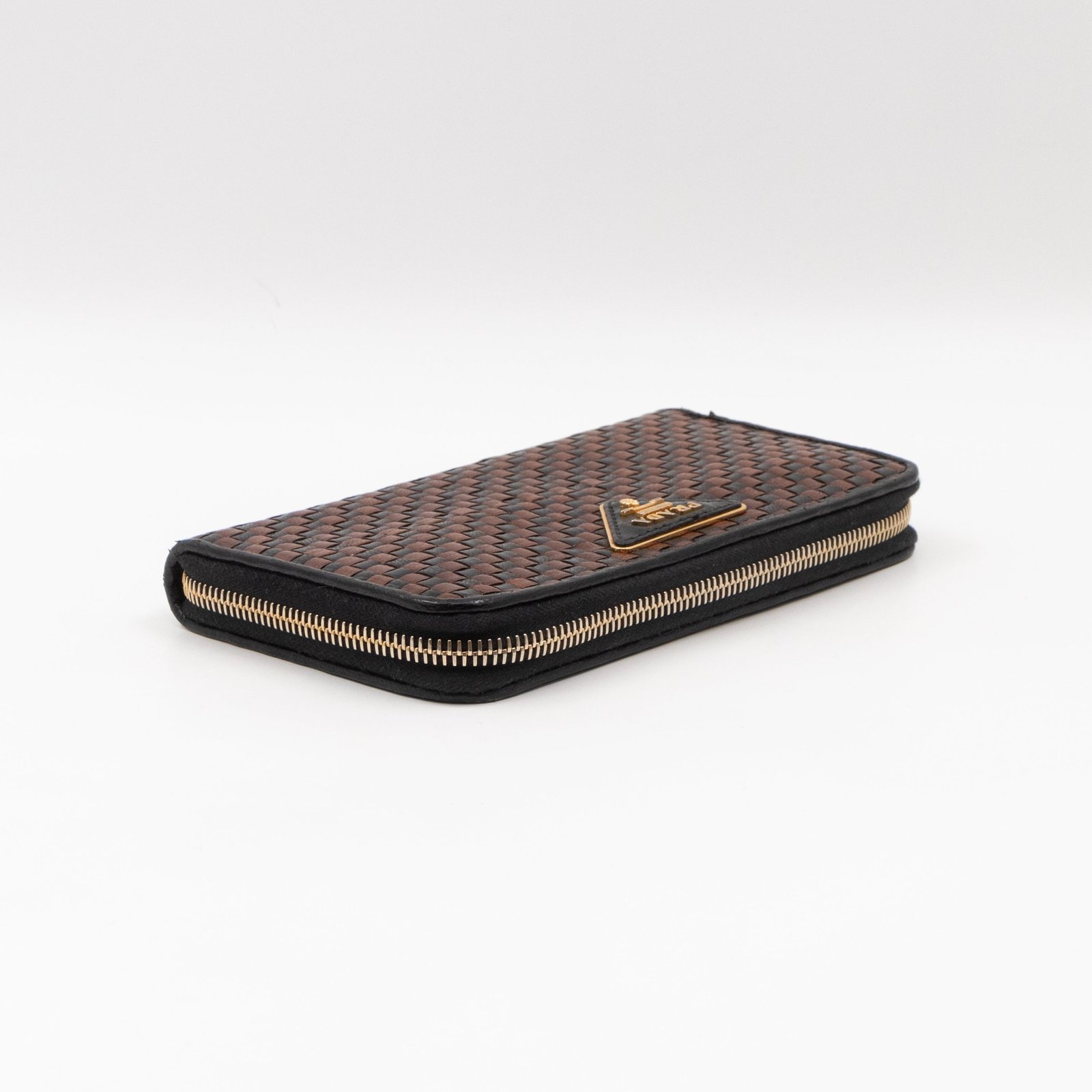 A limited edition Prada Madras series zip around wallet. Made with black and brown leather, in a stunning woven pattern. On the front a large Prada logo. Opens up to several card slots and a zipper pocket in the middle.