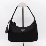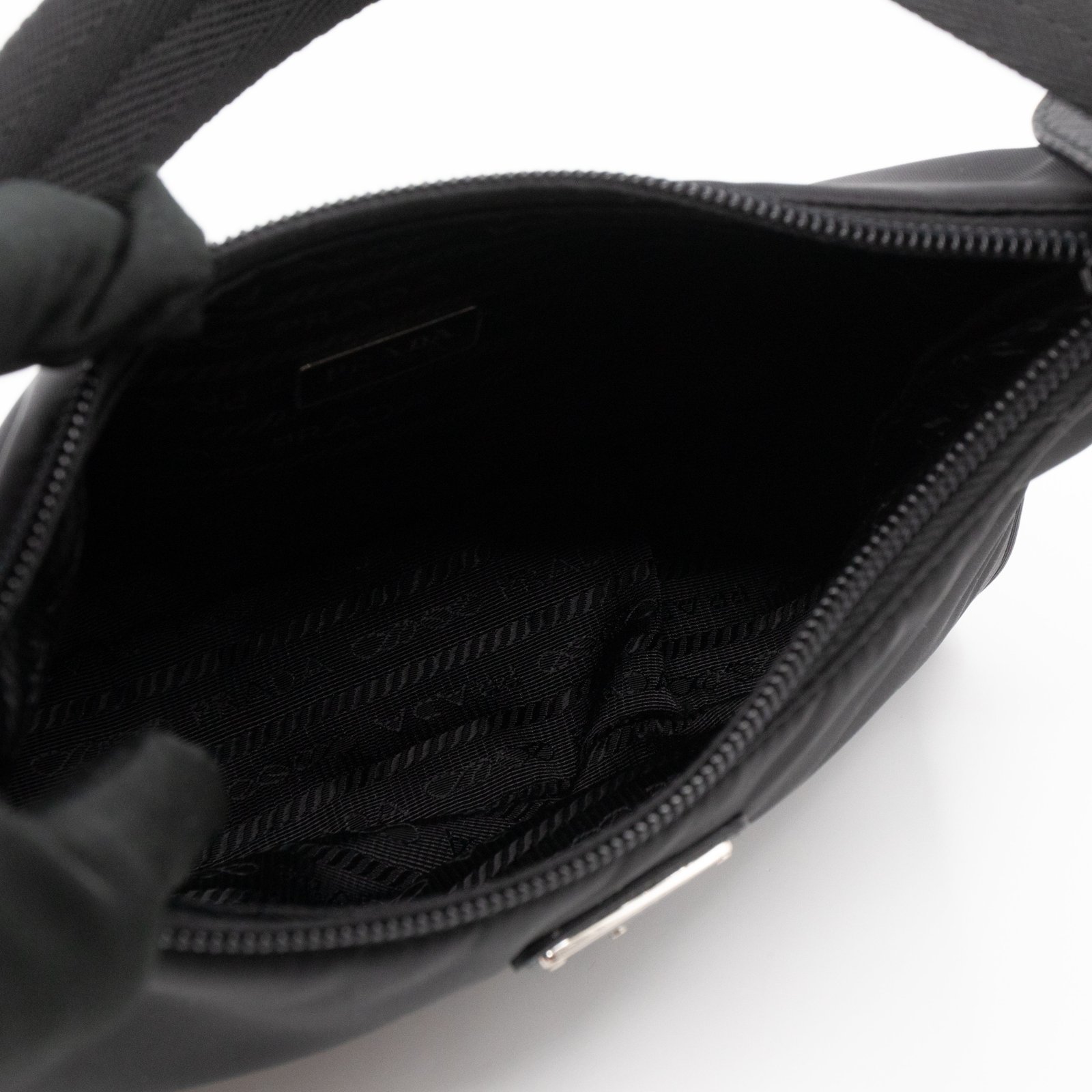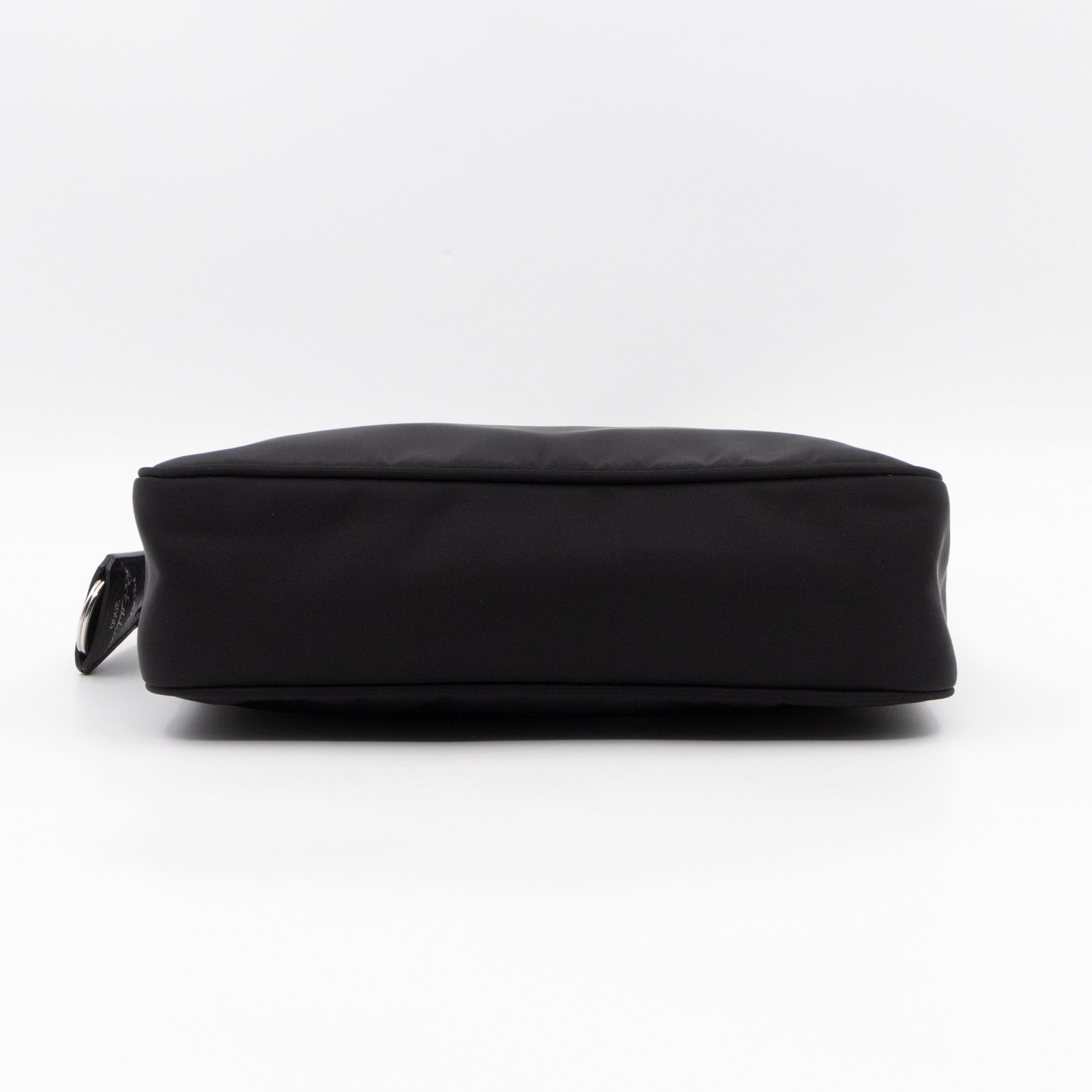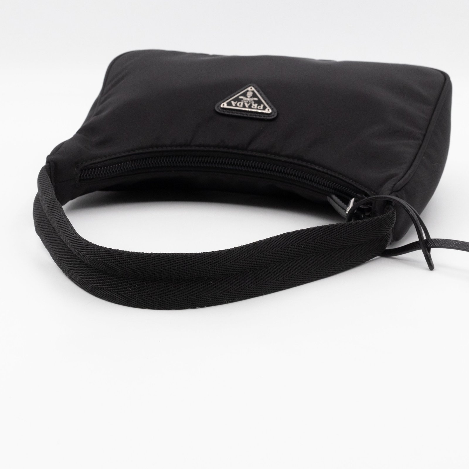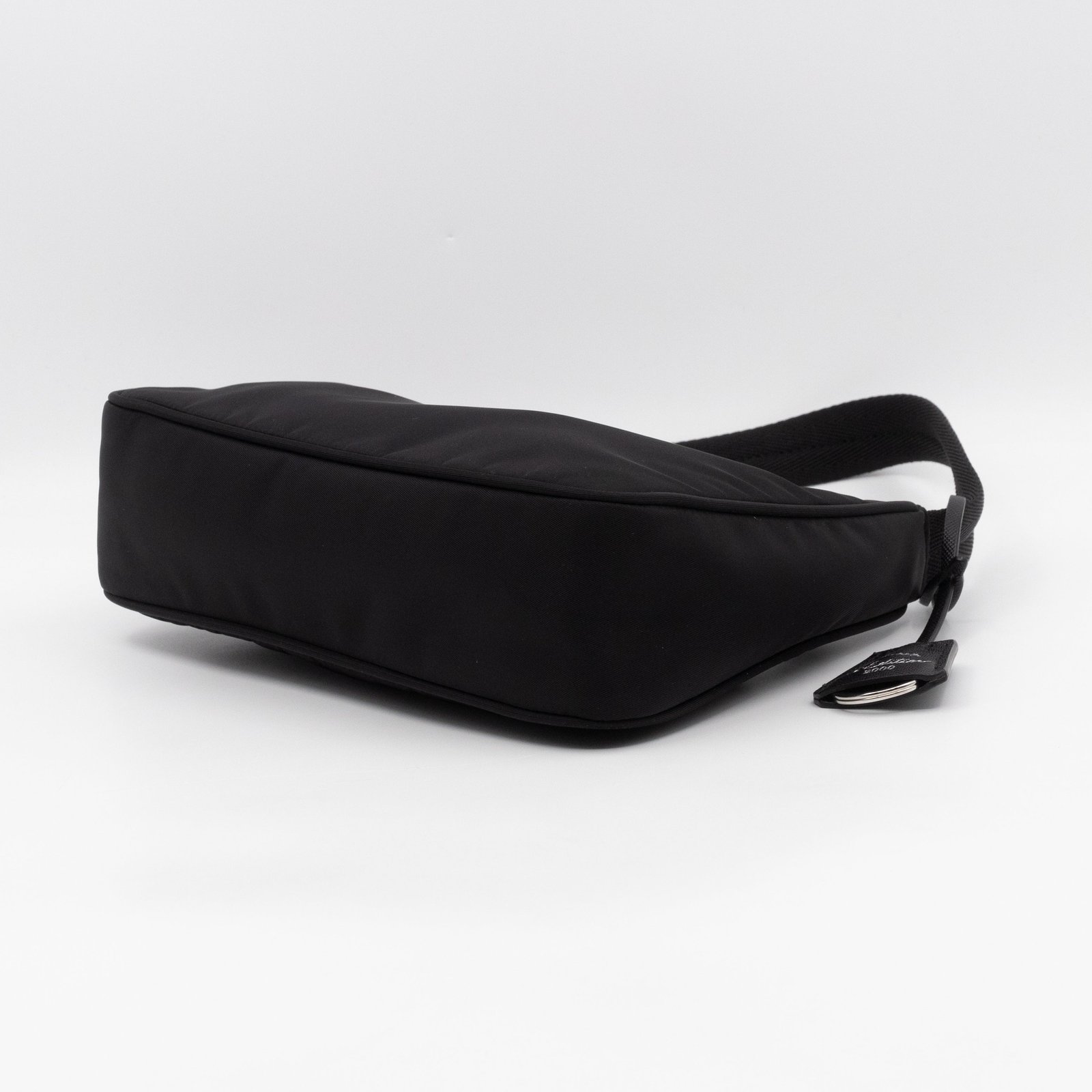This is a Prada Tessuto Nylon Mini Re-Edition 2000. Made of sturdy black tessuto nylon with silver hardware. This bag features a nylon shoulder strap and the top zipper opens to a black jacquard fabric interior. Inside fits phone like iPhone Pro Max size and your daily essentials. This mini sized Prada 2000 can be shoulder carried only, only the larger 2005 can be used crossbody. Current retail price is €920.