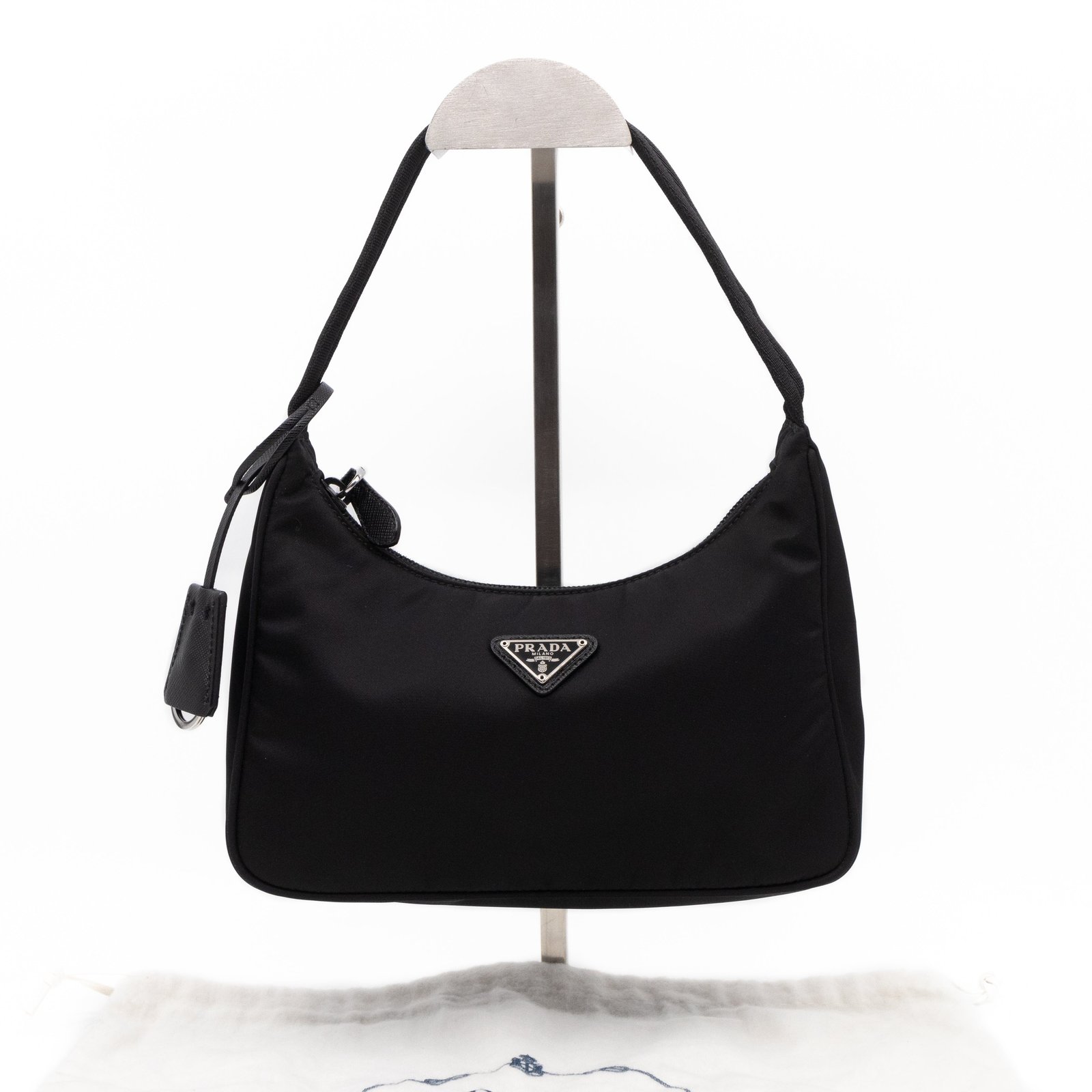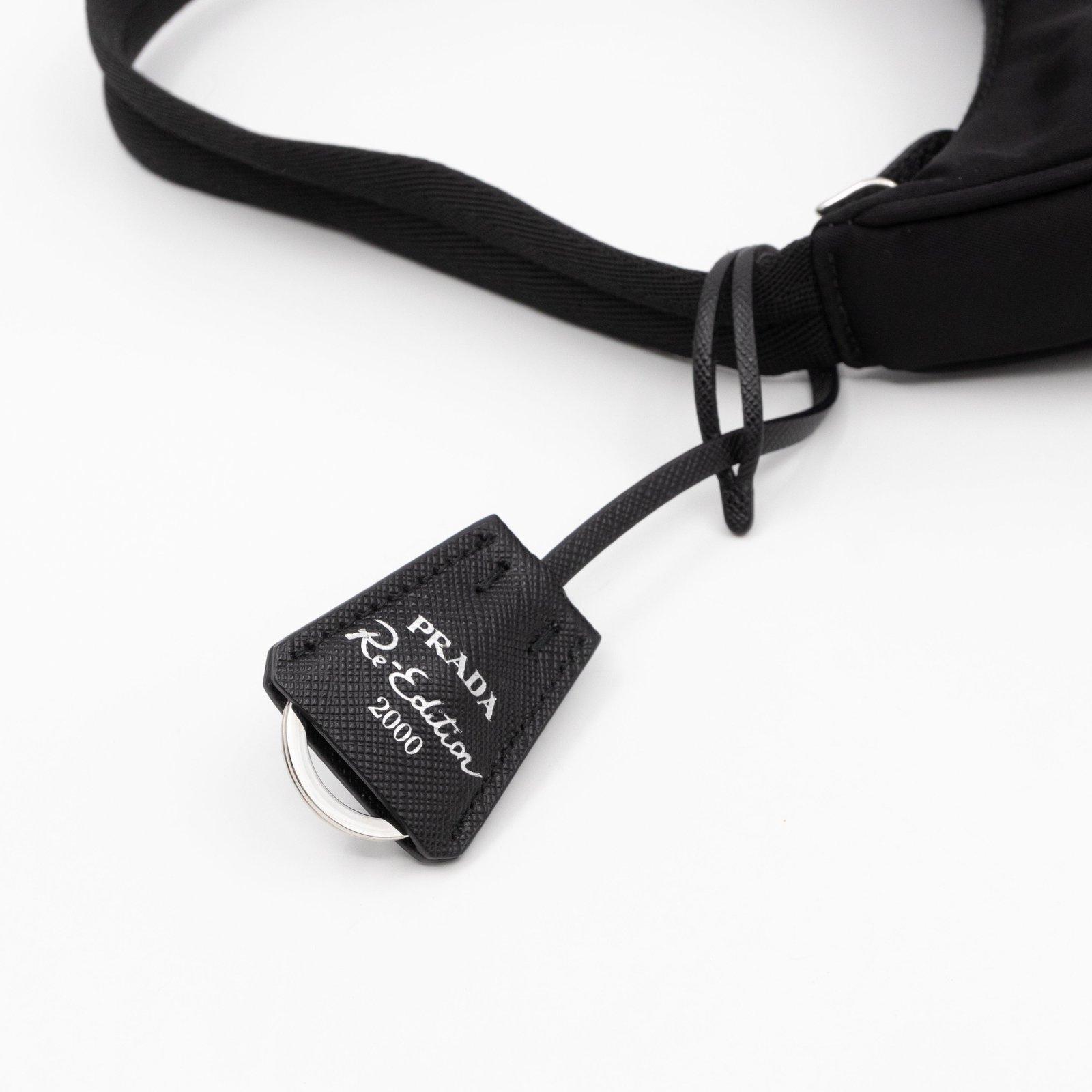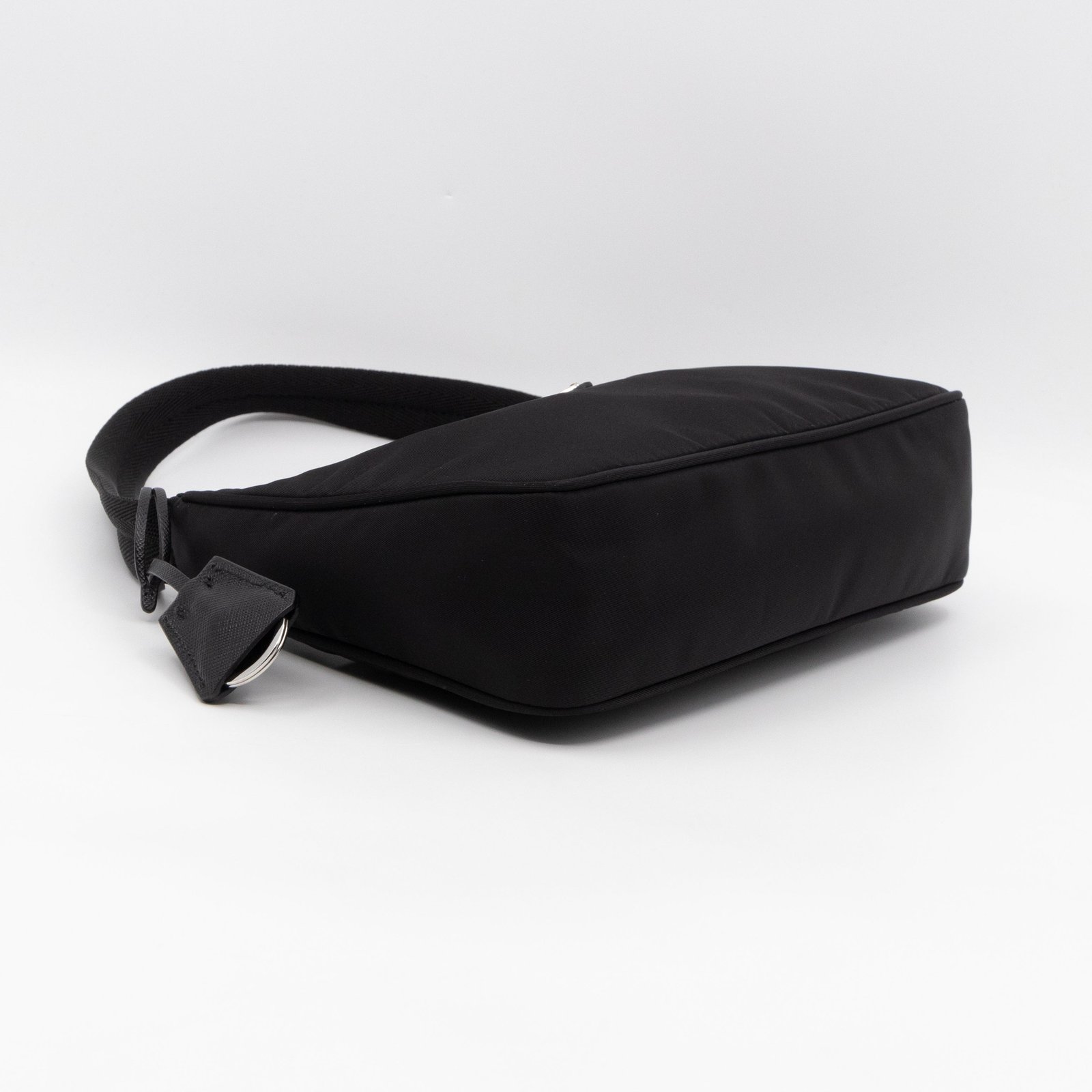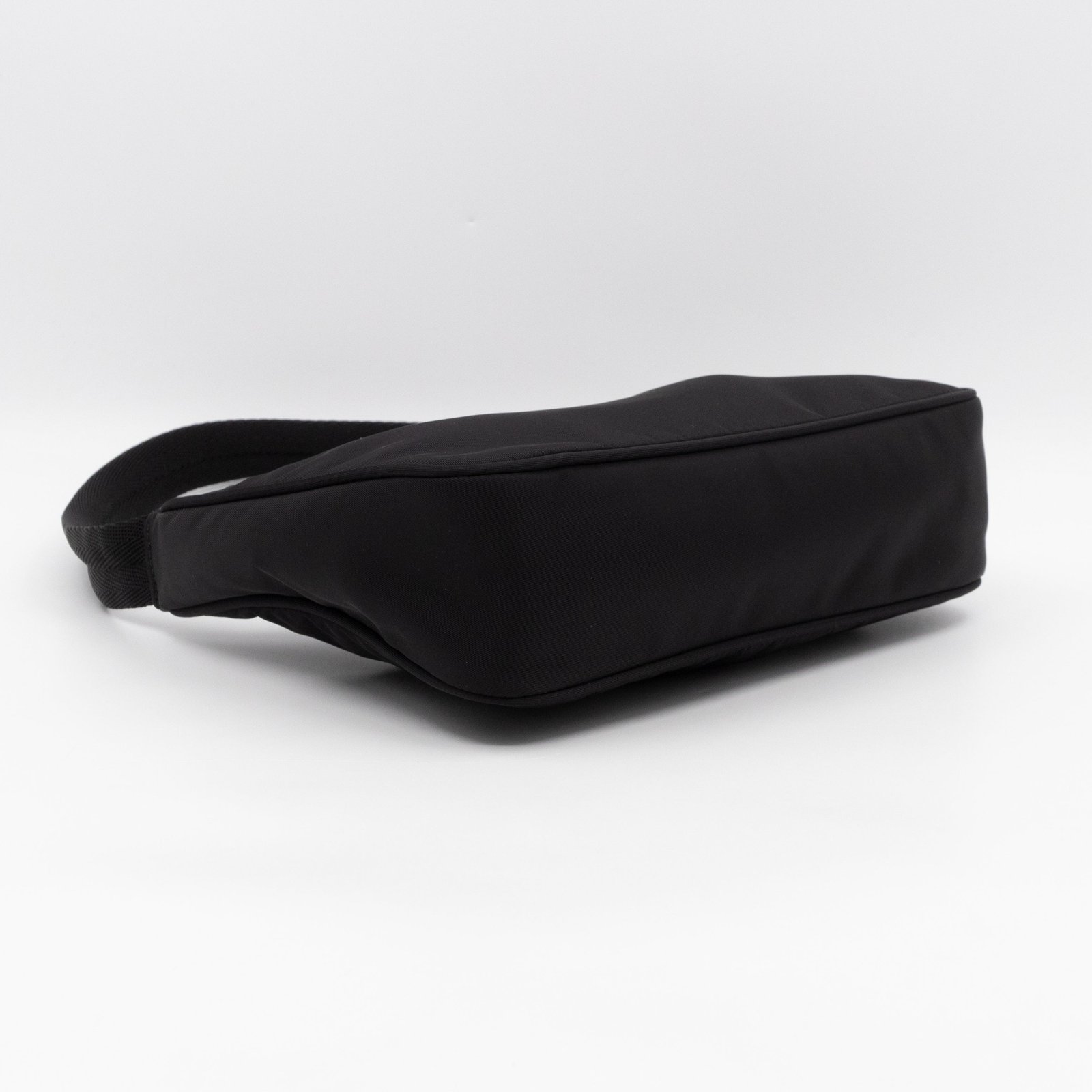 This is a Prada Tessuto Nylon Mini Re-Edition 2000. Made of sturdy black tessuto nylon with silver hardware. This bag features a nylon shoulder strap and the top zipper opens to a black jacquard fabric interior. Inside fits phone like iPhone Pro Max size and your daily essentials. This mini sized Prada 2000 can be shoulder carried only, only the larger 2005 can be used crossbody. Current retail price is €920.
