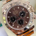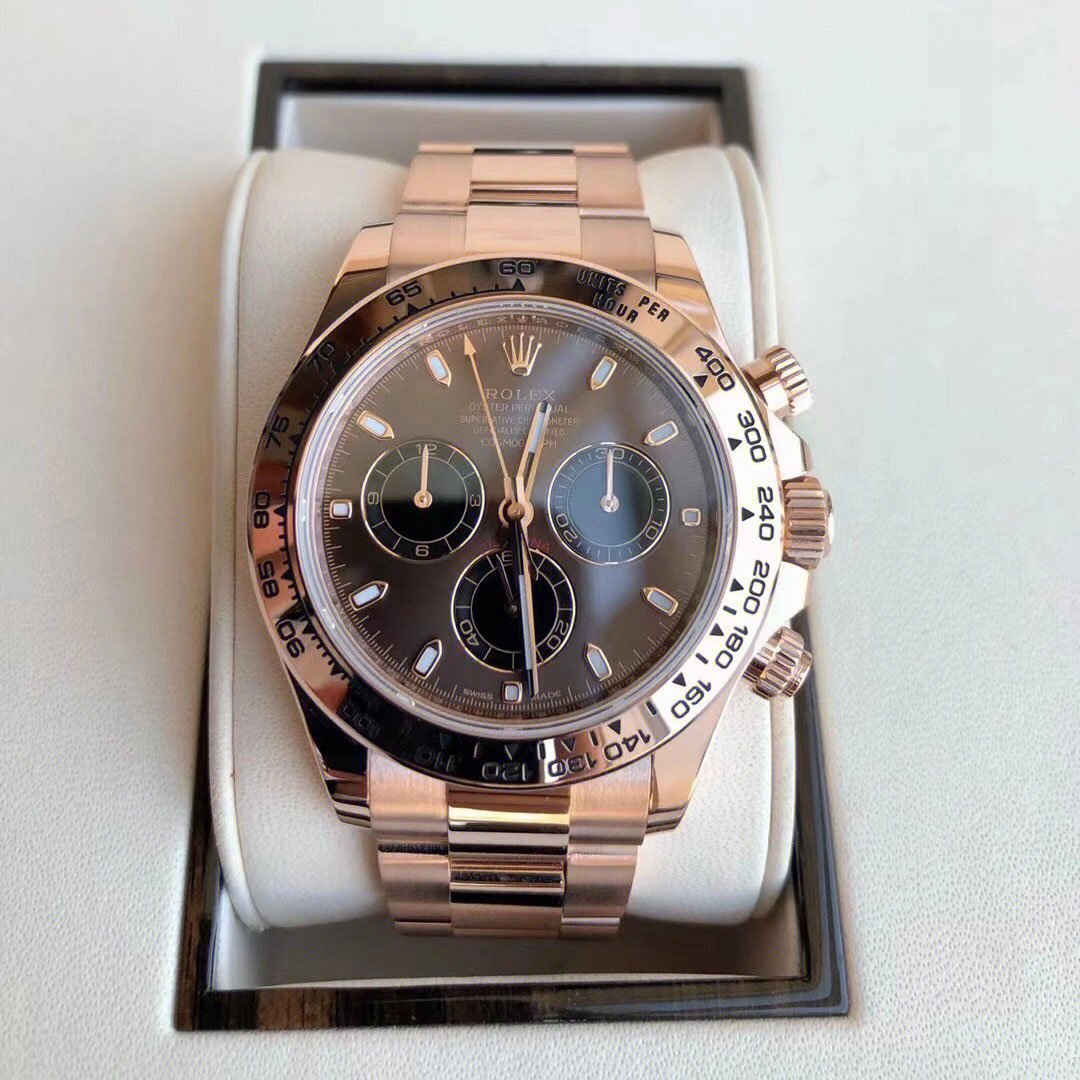 THIS OYSTER PERPETUAL COSMOGRAPH DAYTONA IN 18 CT EVEROSE GOLD, WITH A CHOCOLATE AND BLACK DIAL AND AN OYSTER BRACELET, FEATURES AN 18 CT EVEROSE GOLD BEZEL WITH ENGRAVED TACHYMETRIC SCALE.