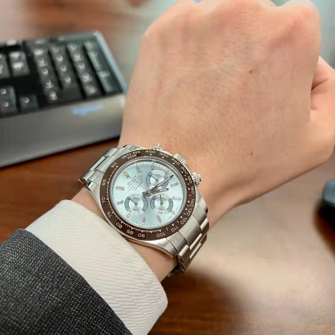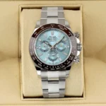 Hands-on look at the Rolex Cosmograph Daytona 116506 platinum watch with brown ceramic bezel and ice blue dial.