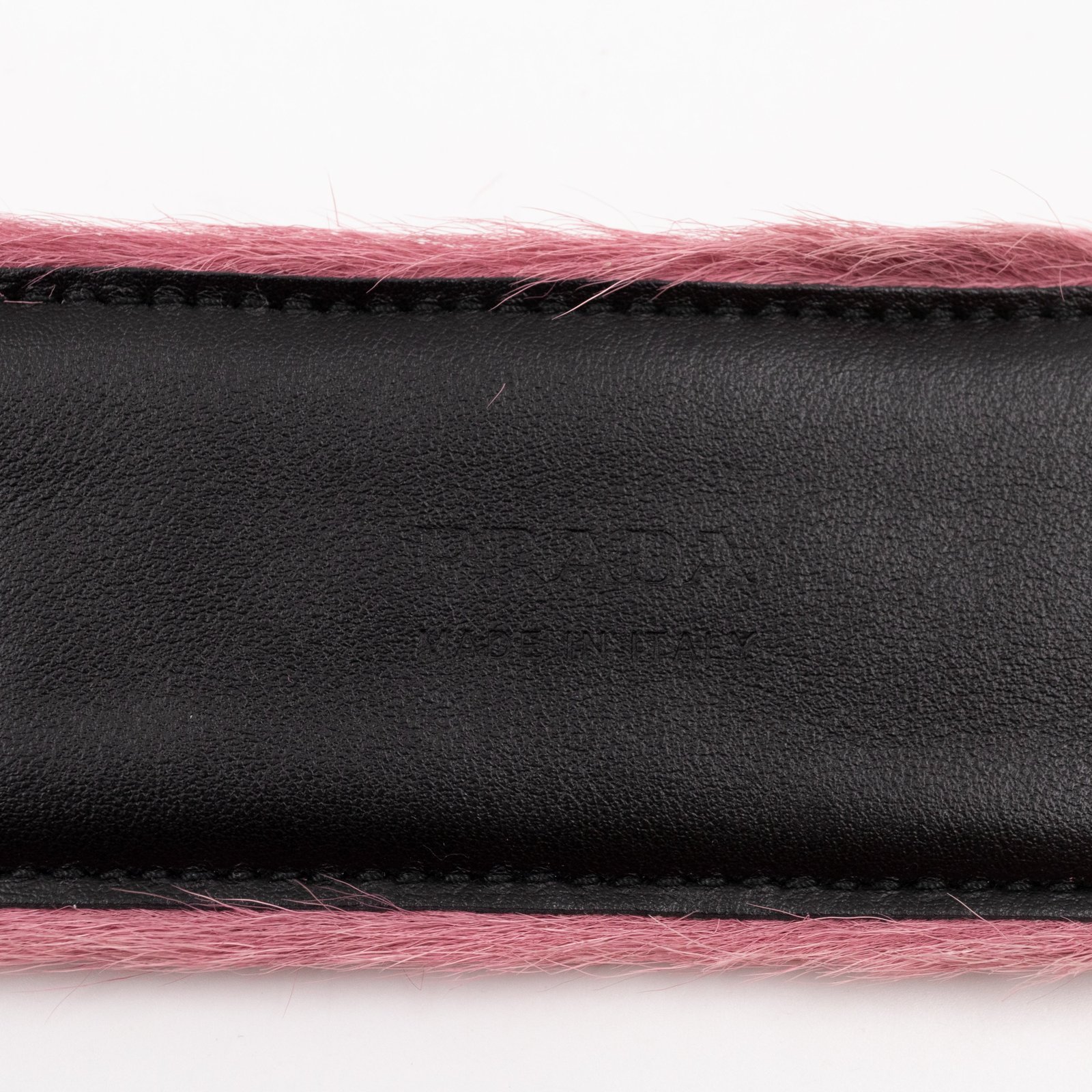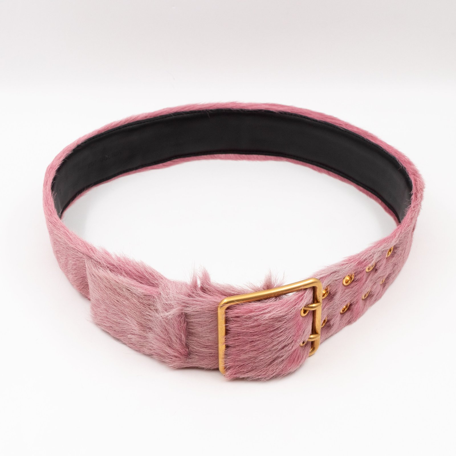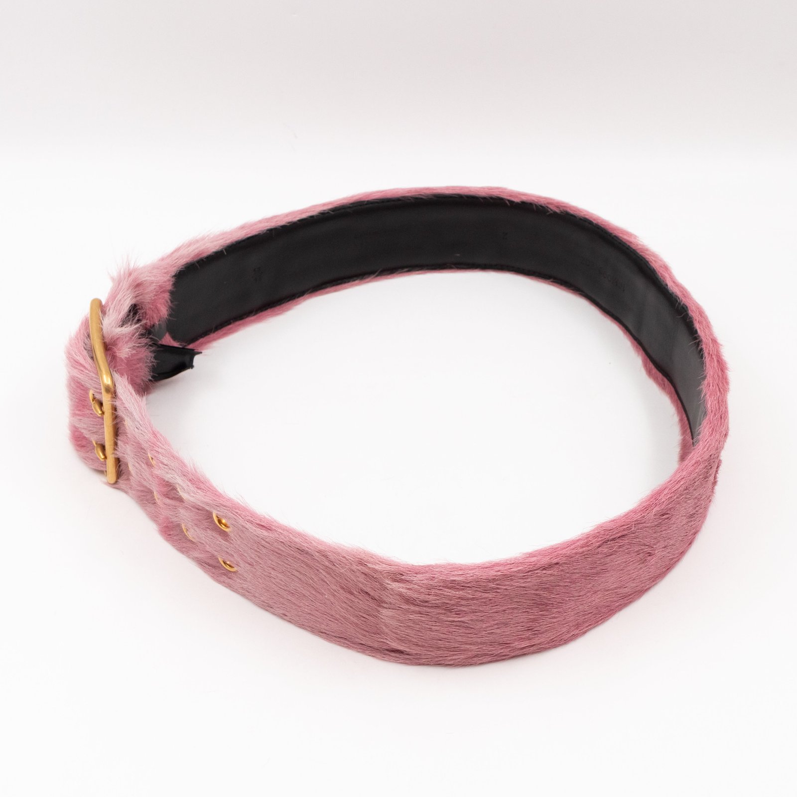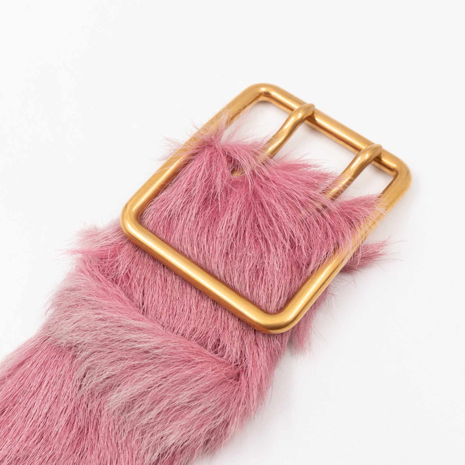 This is a rare Runway Wide fur belt from Prada. It is crafted from shaggy pink calf fur and completed with aged gold hardware. The back side is made with black leather. Belt length is 85 cm / 34 inch, width is 5 cm. Retail price is around €550.