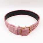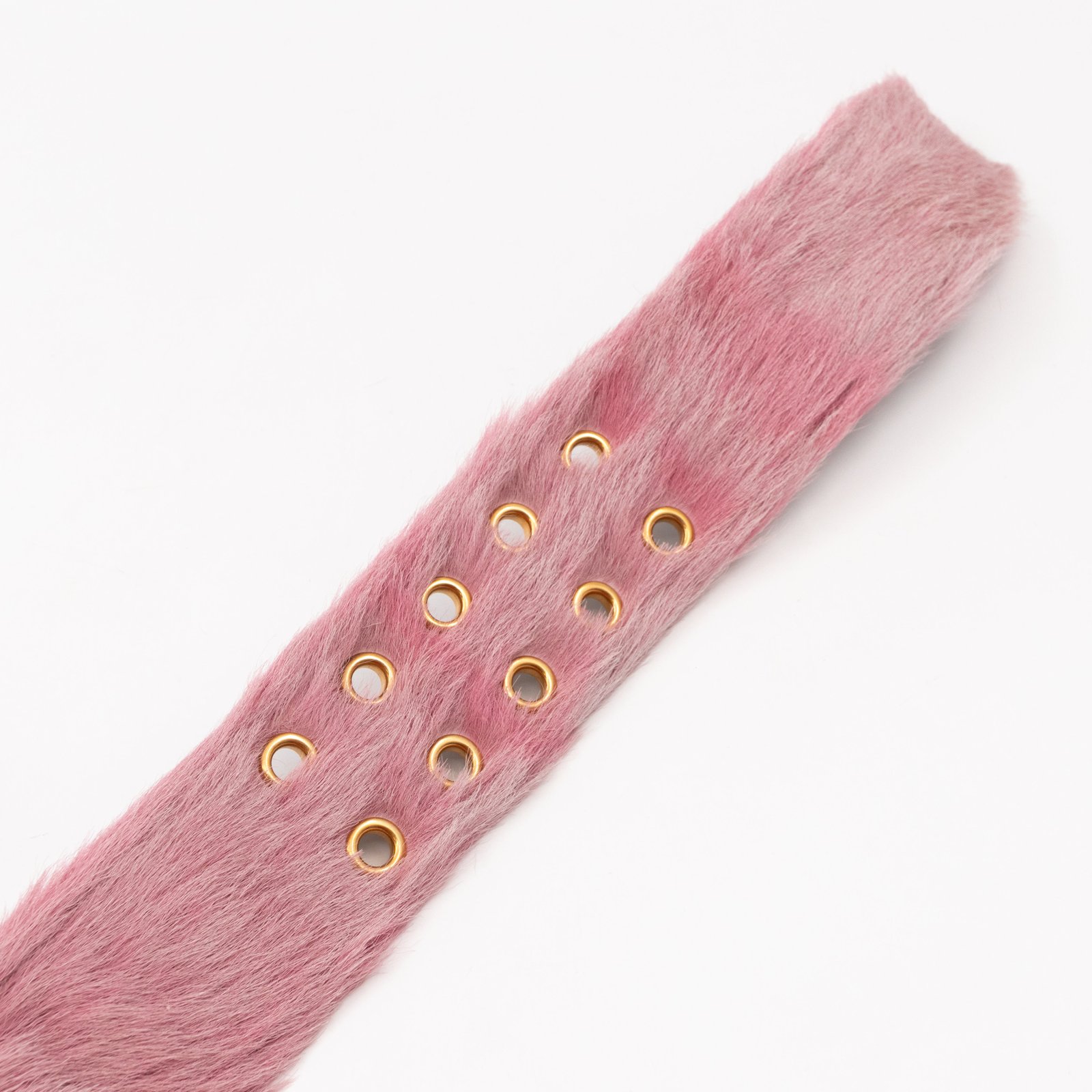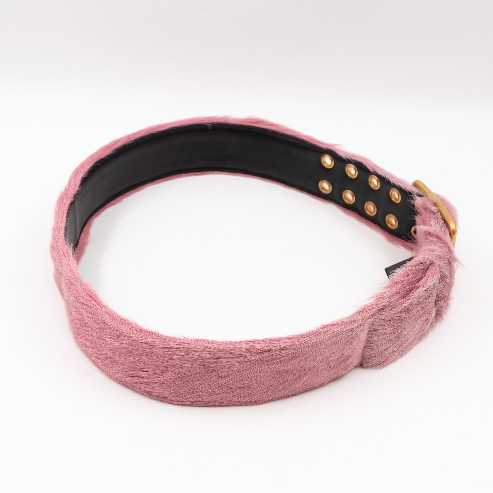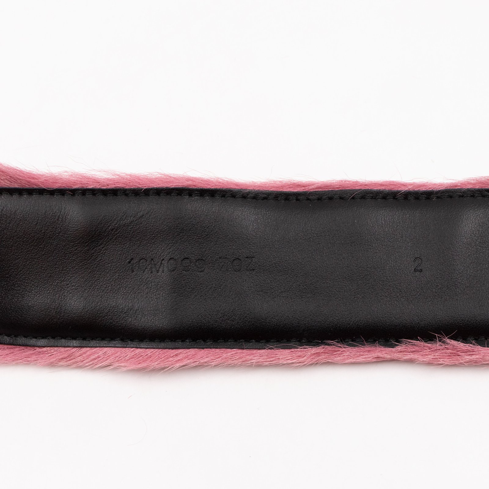 This is a rare Runway Wide fur belt from Prada. It is crafted from shaggy pink calf fur and completed with aged gold hardware. The back side is made with black leather. Belt length is 85 cm / 34 inch, width is 5 cm. Retail price is around €550.