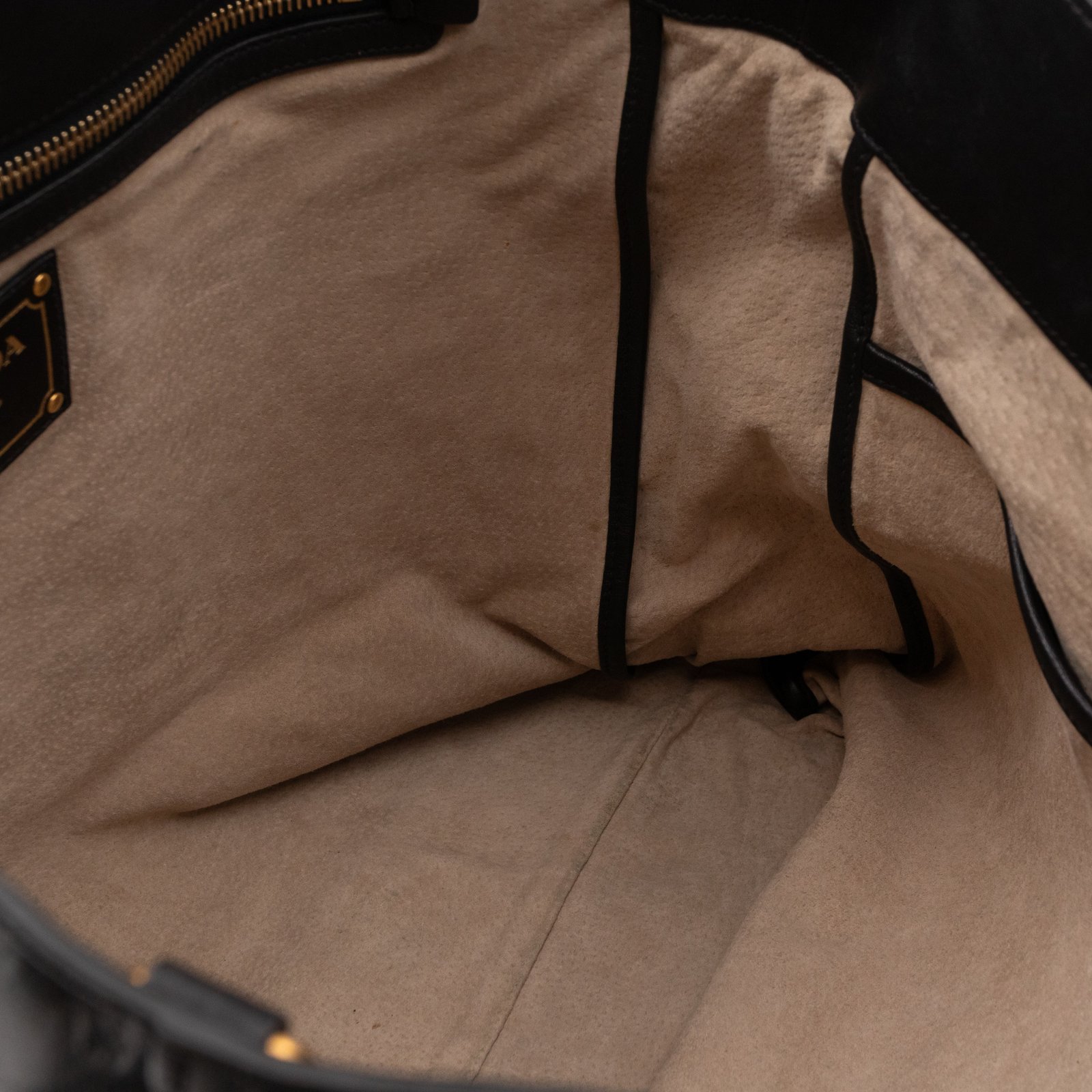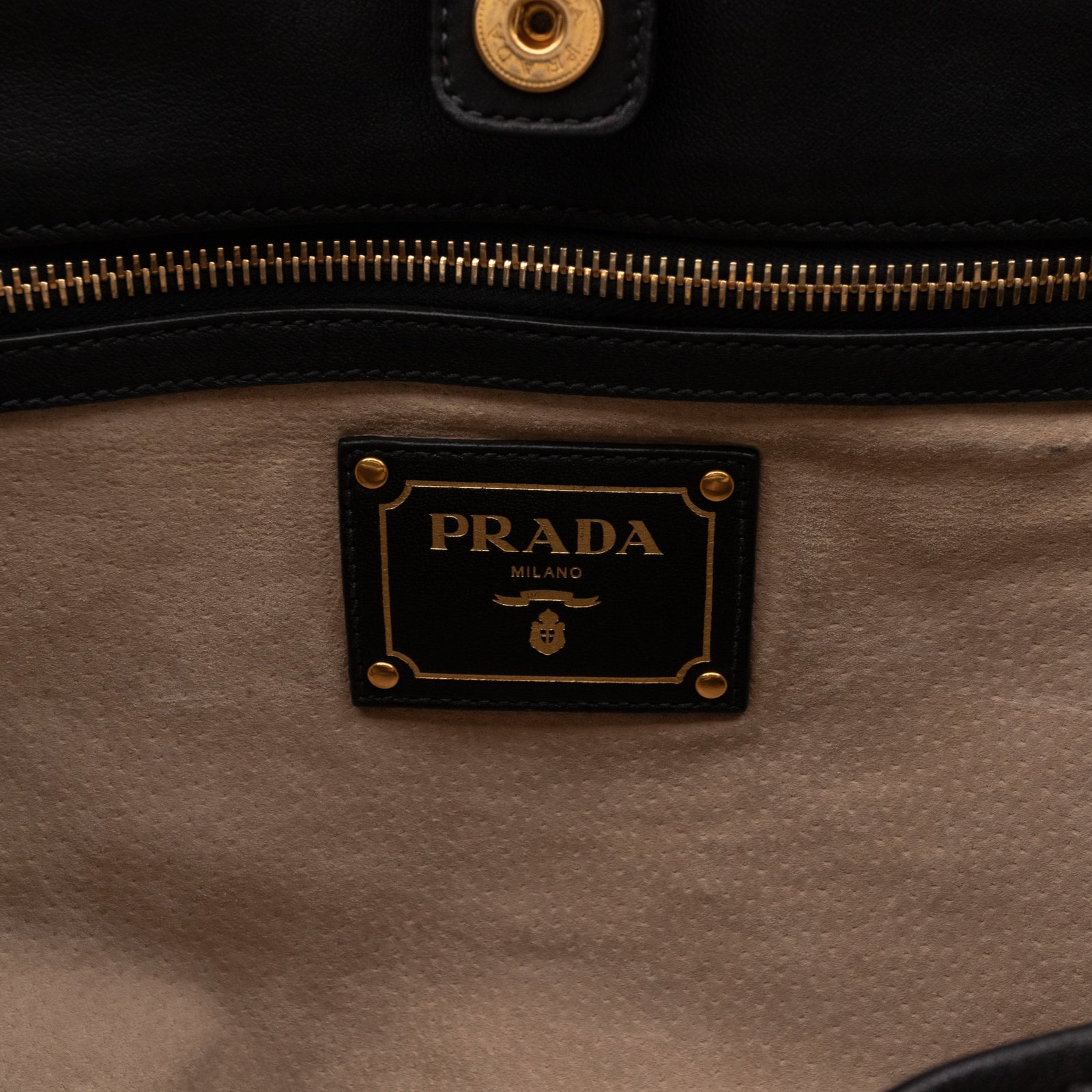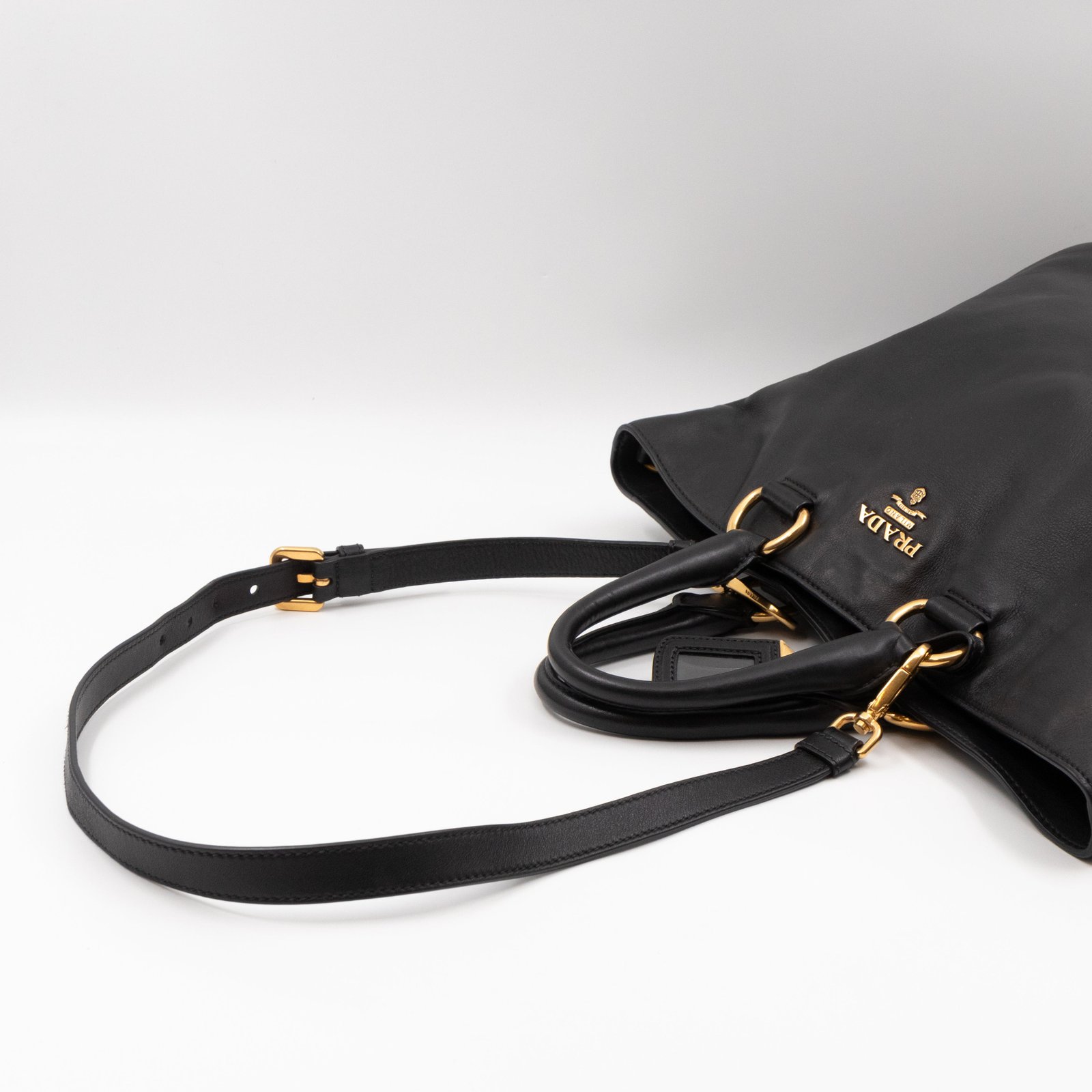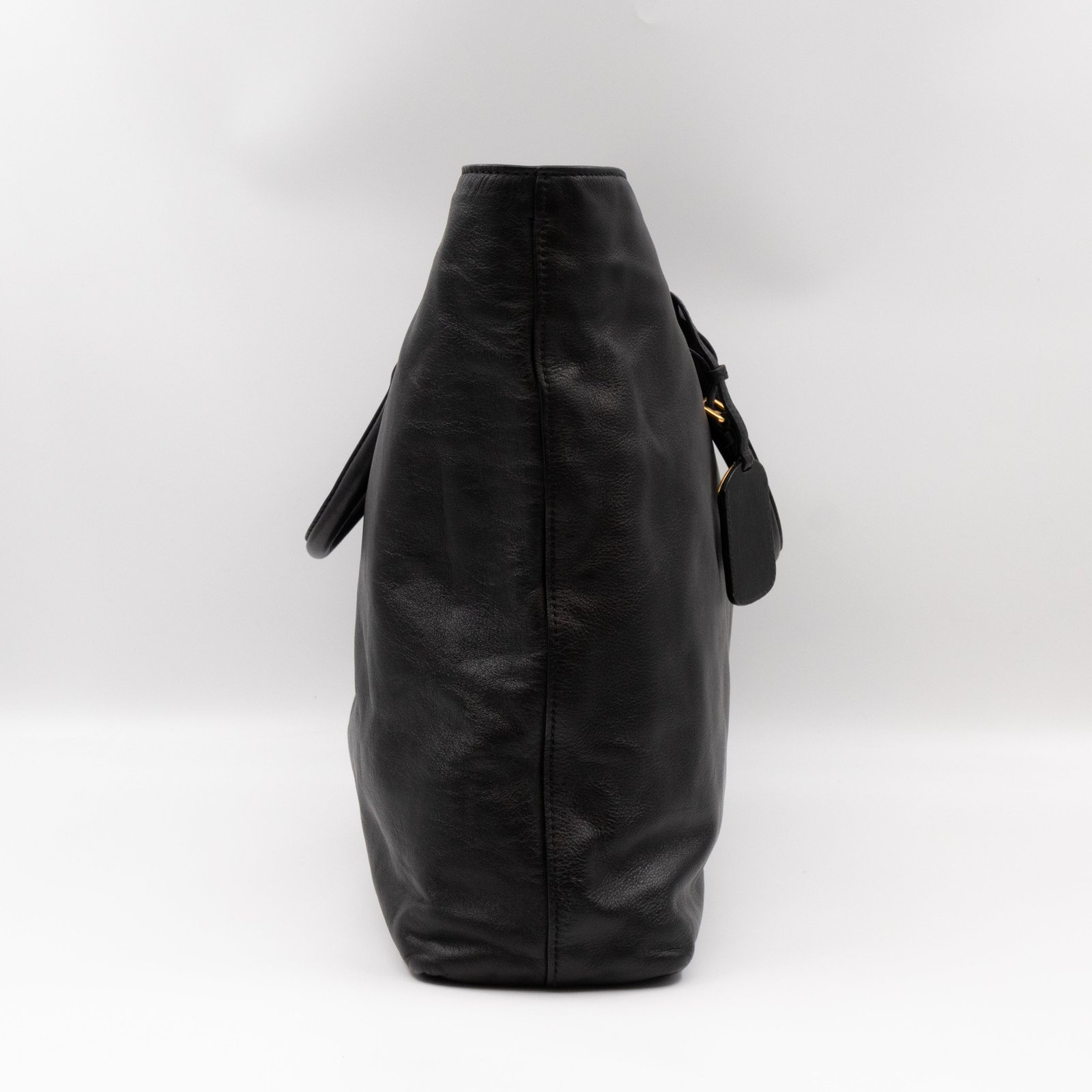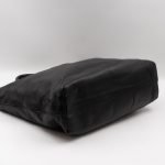 A large and charming shopping tote from Prada. Made with black leather with gold-tone hardware. Dual handles and an adjustable shoulder strap. Spacious insides with slim pocket on one side and a large zipper pocket on the other side. Button closure in the middle to keep your items safe.