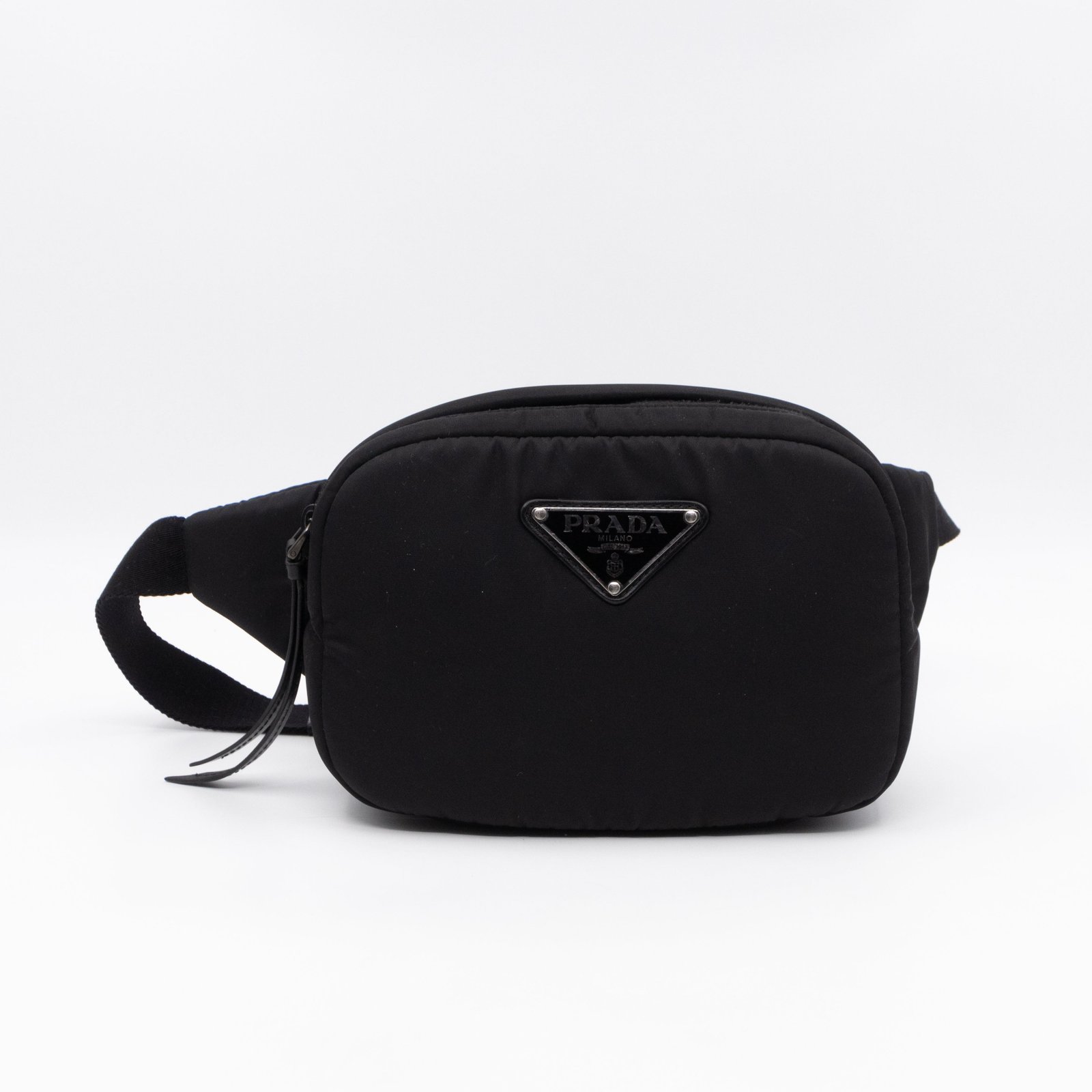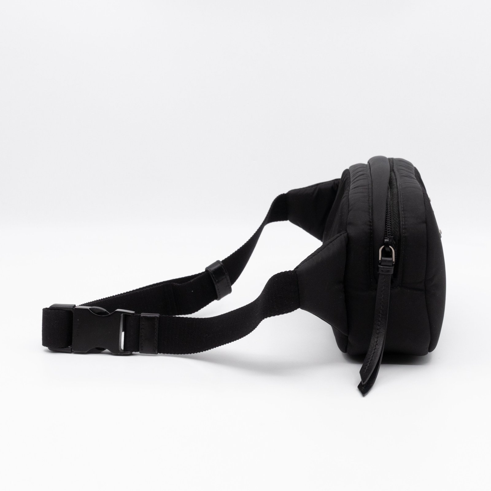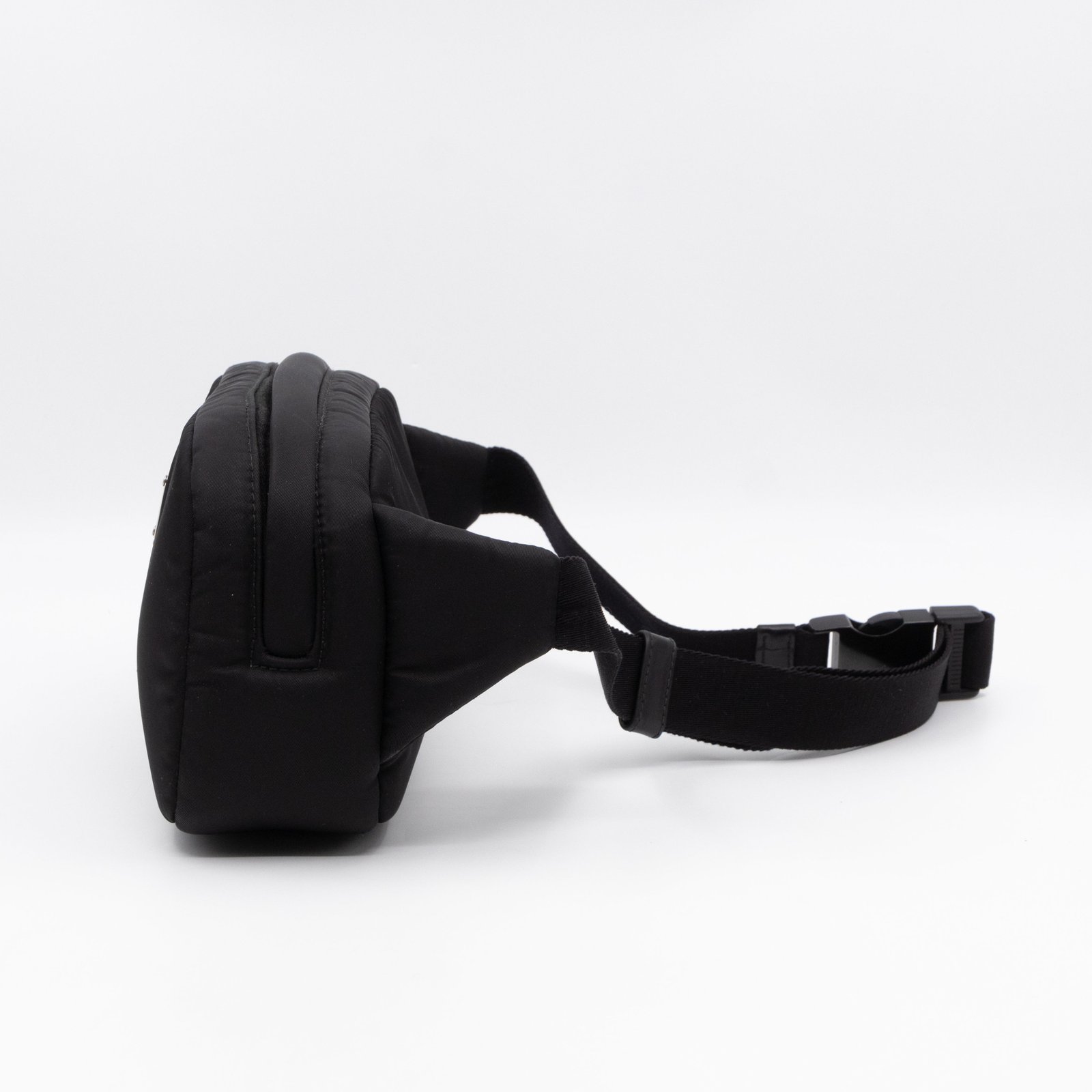 This is the Tessuto Nylon belt bag from Prada. It is made in black tessuto nylon and silver-tone hardware. Spacious design with an adjustable nylon strap. The bag features a long zipper pocket. The top zipper opens to a black fabric interior with a slim pocket. Belt length max. 100 cm. Wear it on the waist for a classic belt bag look.