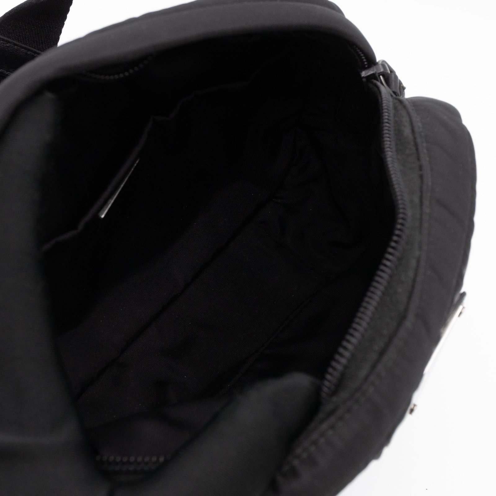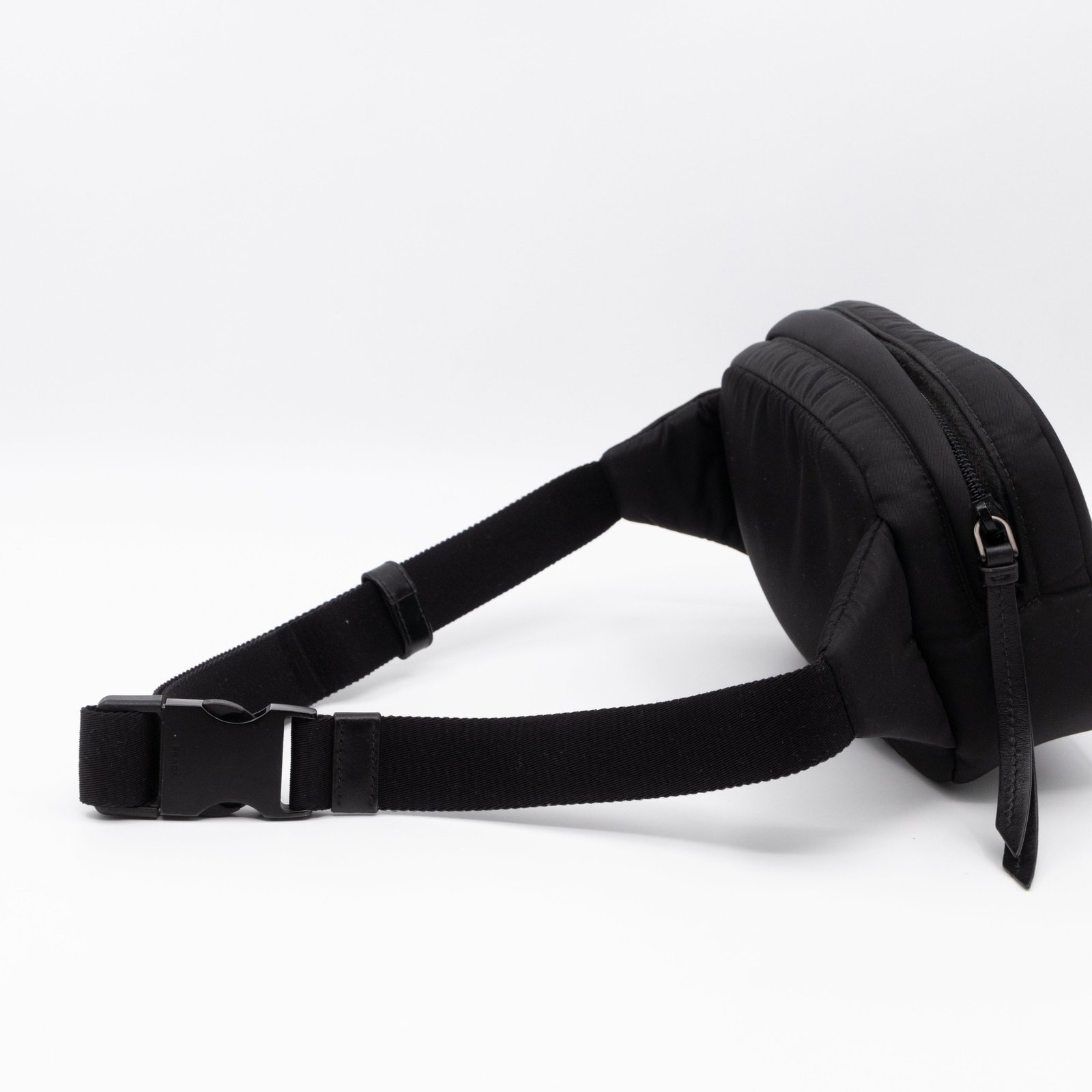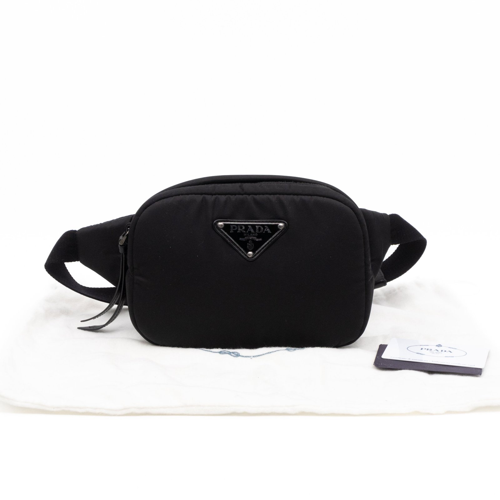 This is the Tessuto Nylon belt bag from Prada. It is made in black tessuto nylon and silver-tone hardware. Spacious design with an adjustable nylon strap. The bag features a long zipper pocket. The top zipper opens to a black fabric interior with a slim pocket. Belt length max. 100 cm. Wear it on the waist for a classic belt bag look.