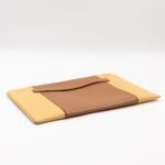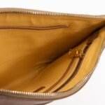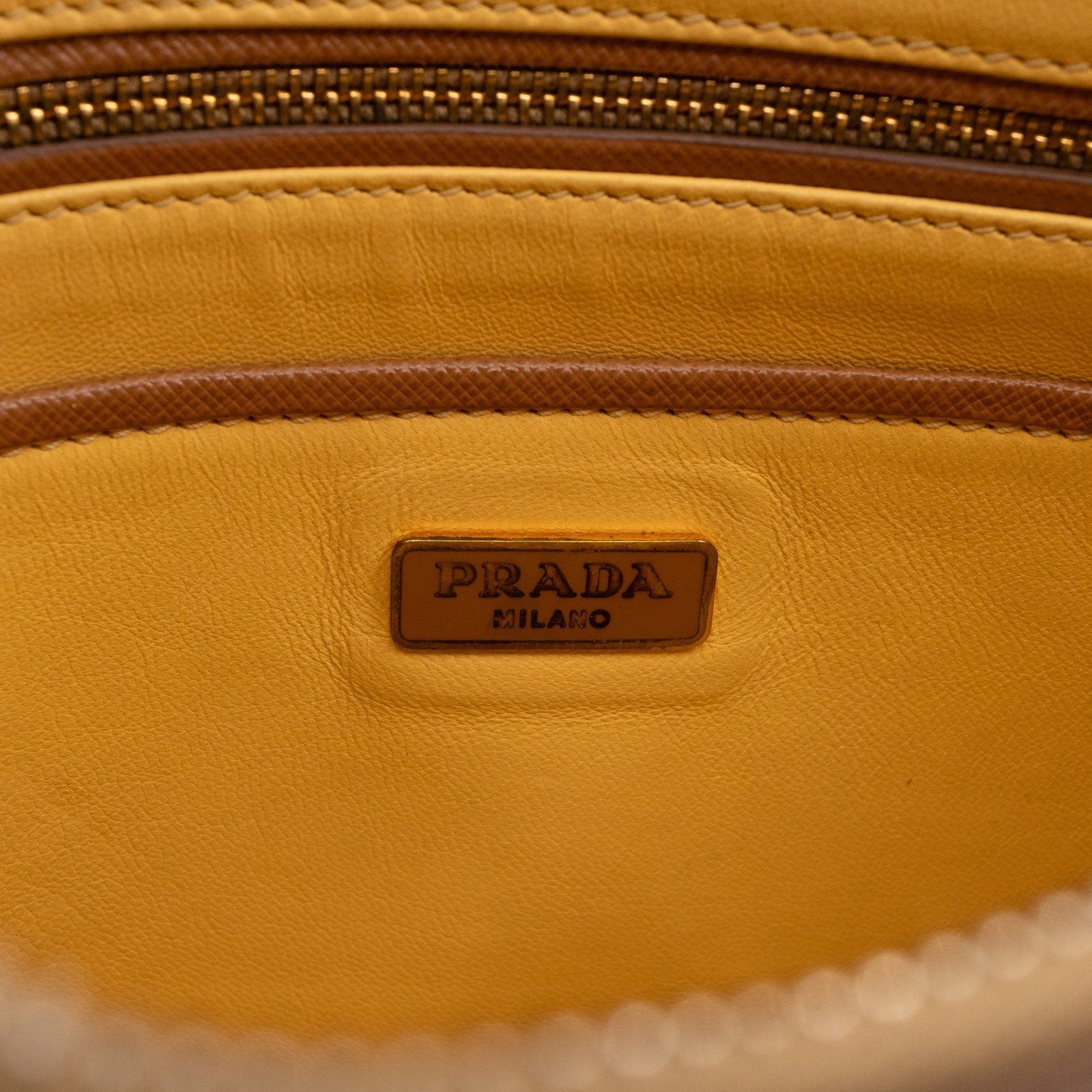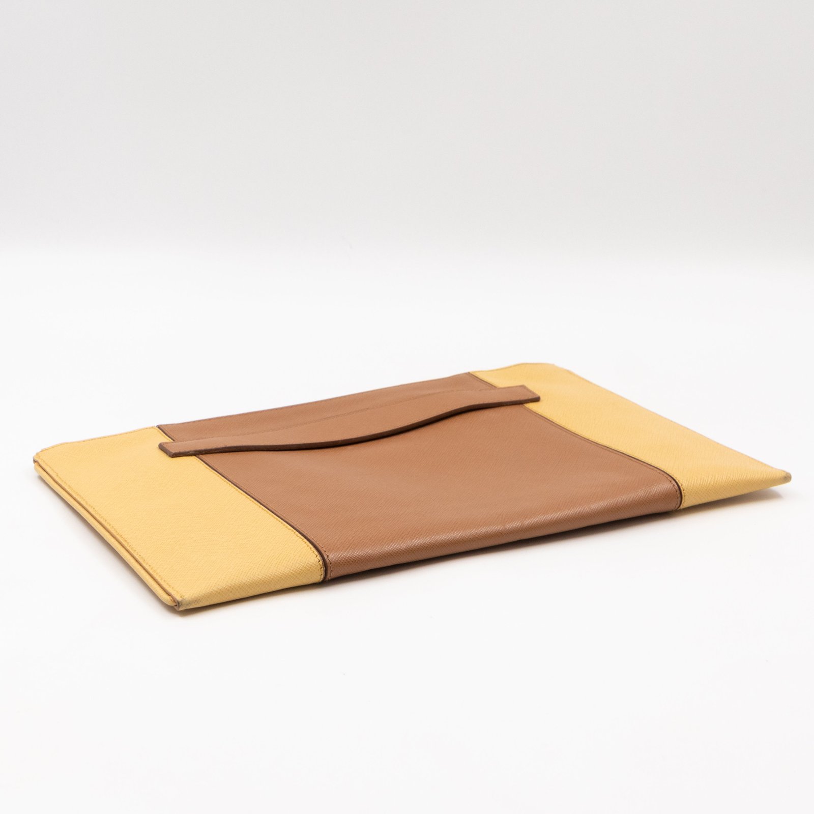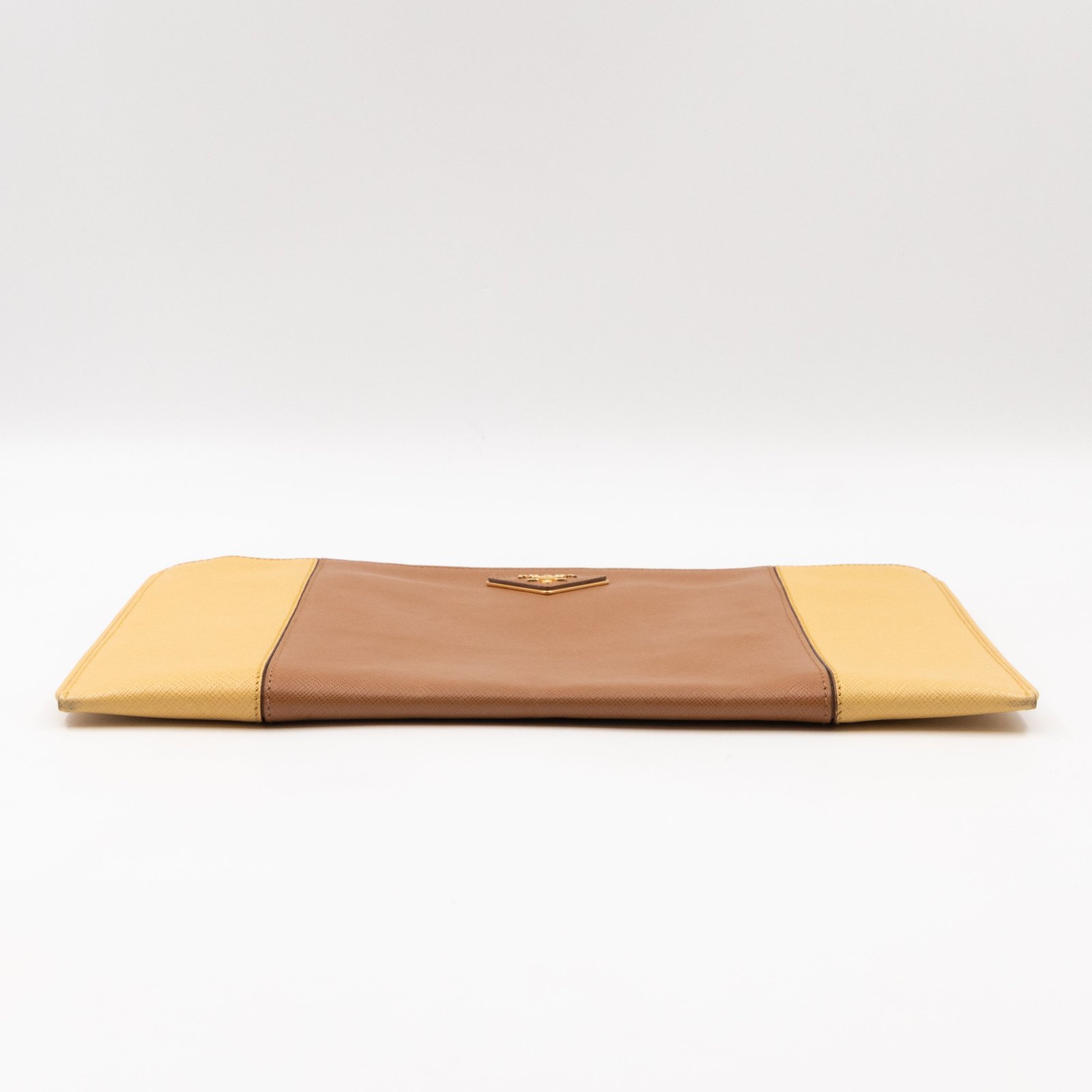 This is a zip clutch bag from Prada. It is made with saffiano leather in yellow and brown color, features a wrist strap on one side, and with a gold-tone Prada logo on the front. The interior is spacious enough with a zipper pocket. There is a handle on the back to carry it more easily. A good choice for an evening event.